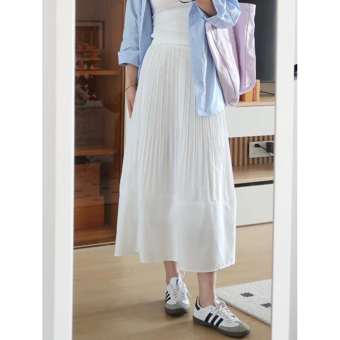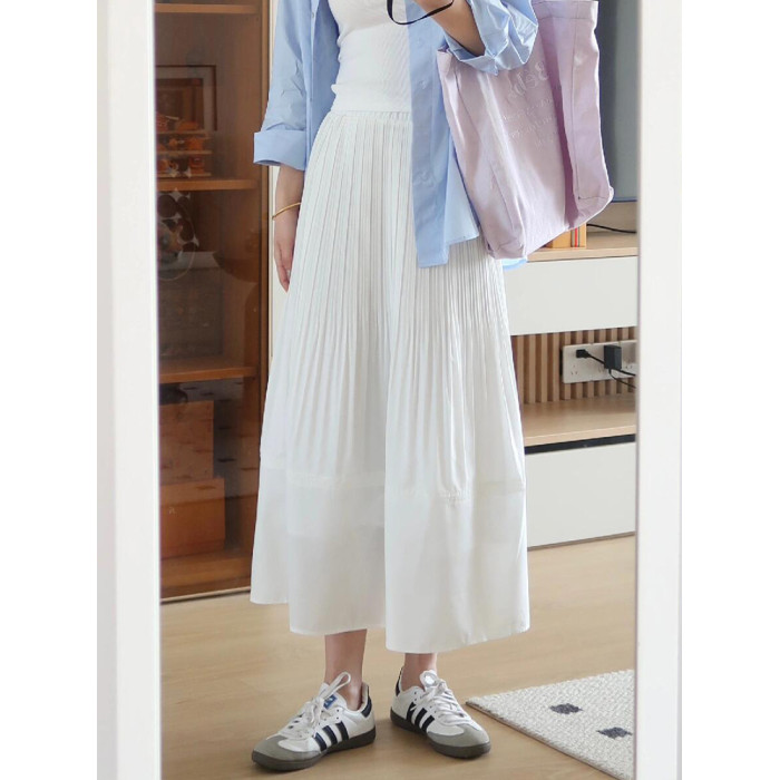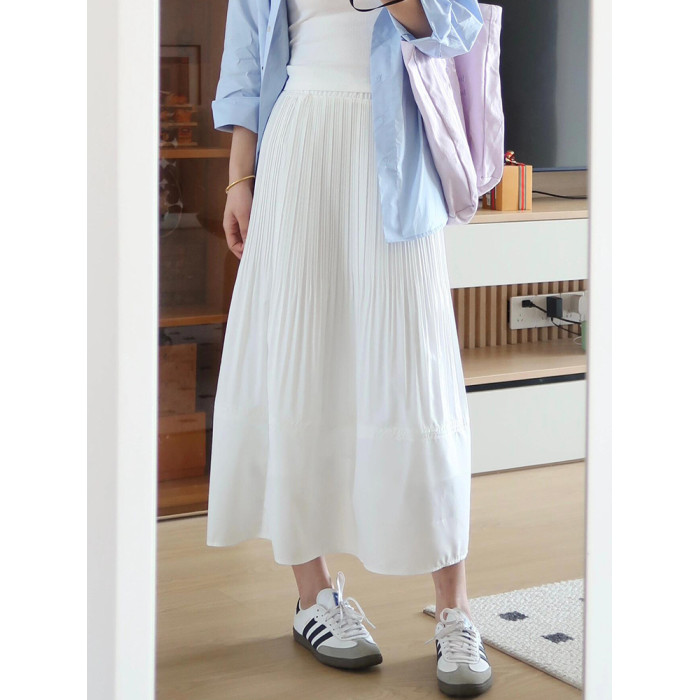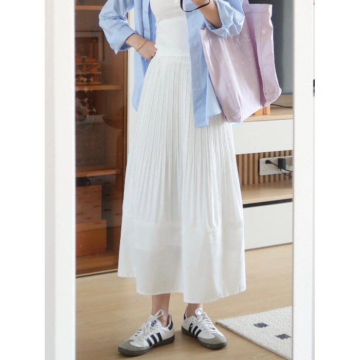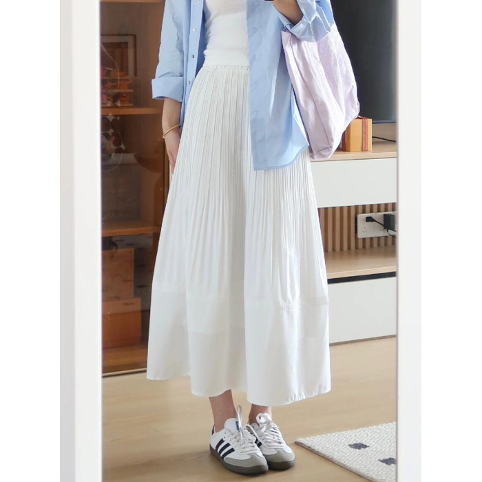 張SeSe 25夏季 白色赫本美學氛圍感繖狀抗皺壓褶時裝感飄逸半身裙