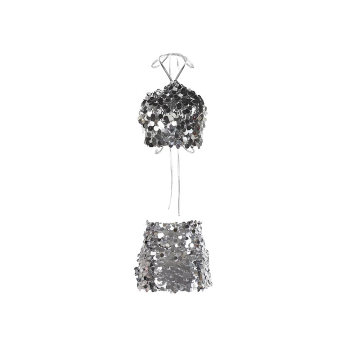辣妹重工亮片露臍性感掛脖背心2025夏季純欲風修身夜店風包臀短裙