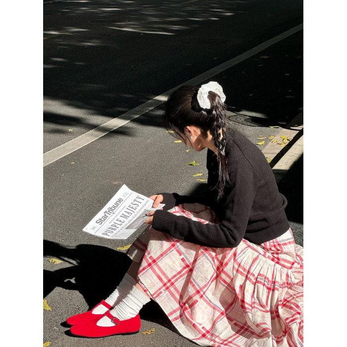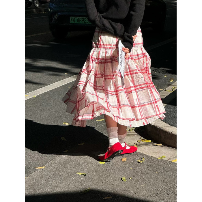 正確版復古紅色格子寬松大擺繖裙高腰a字蛋糕裙春長款半身裙
