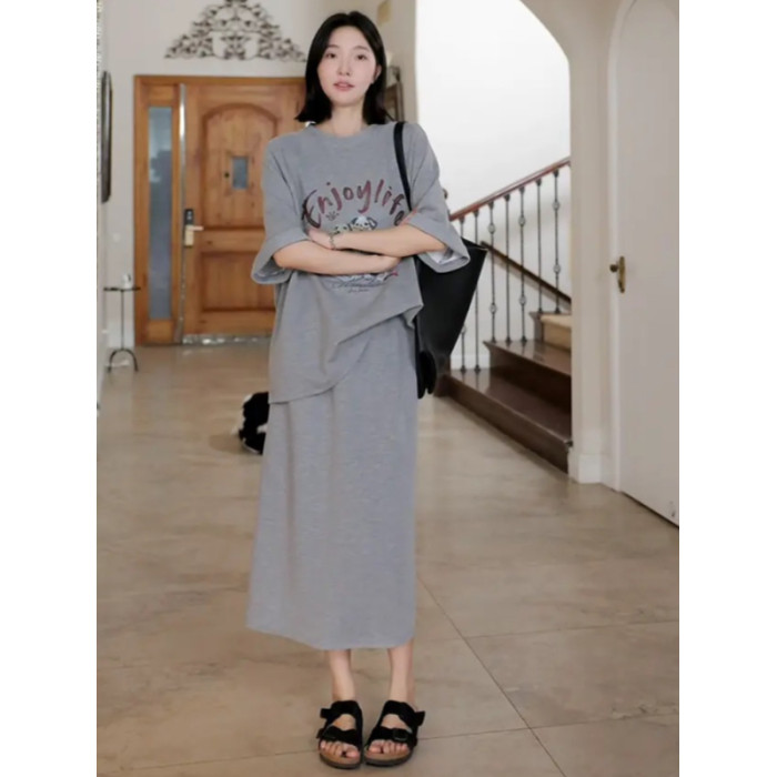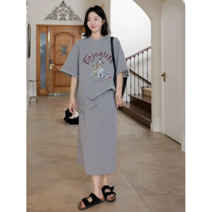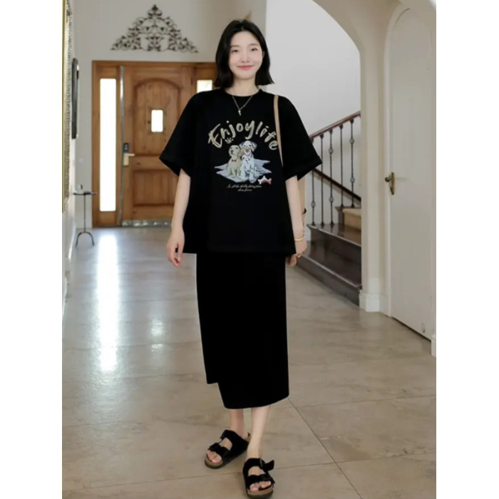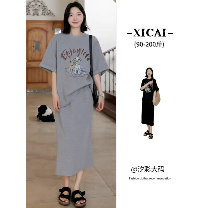 大碼休閒慵懶風顯瘦套裝女夏季新款胖mm時尚印花t恤+半身裙兩件套