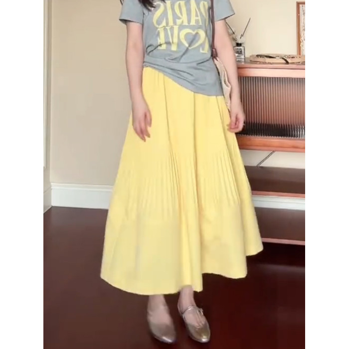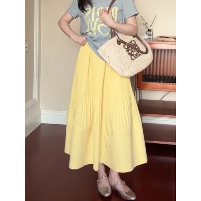96Kiuo 25秋季新品 赫本美學氛圍感繖狀抗皺壓褶飄逸奶黃色半身裙