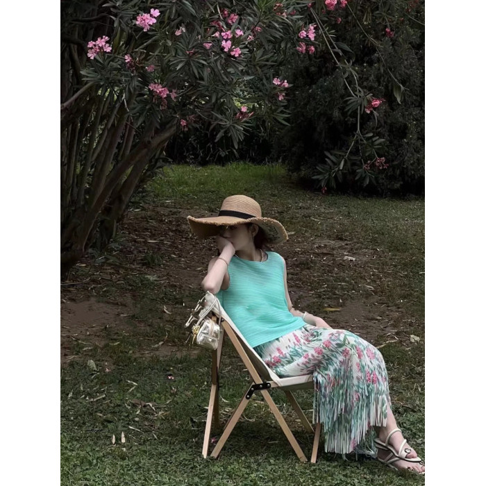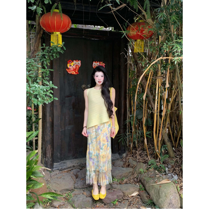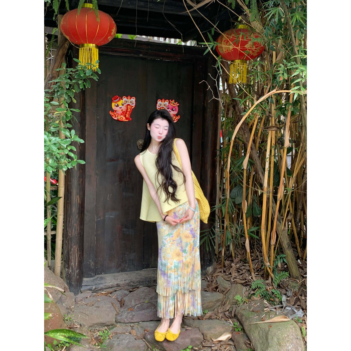 度假碎花雙層流蘇半身裙褶皺百褶裙高級感仙女裙今年流行套裝裙
