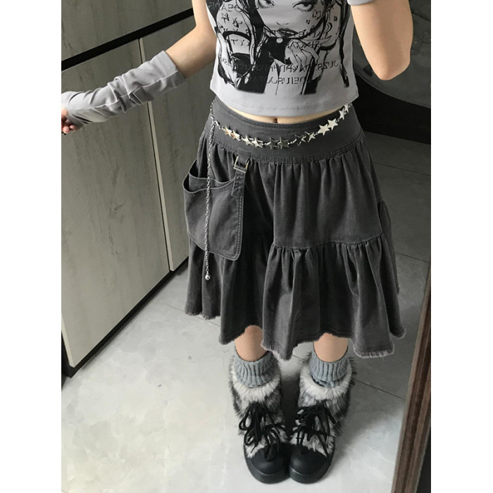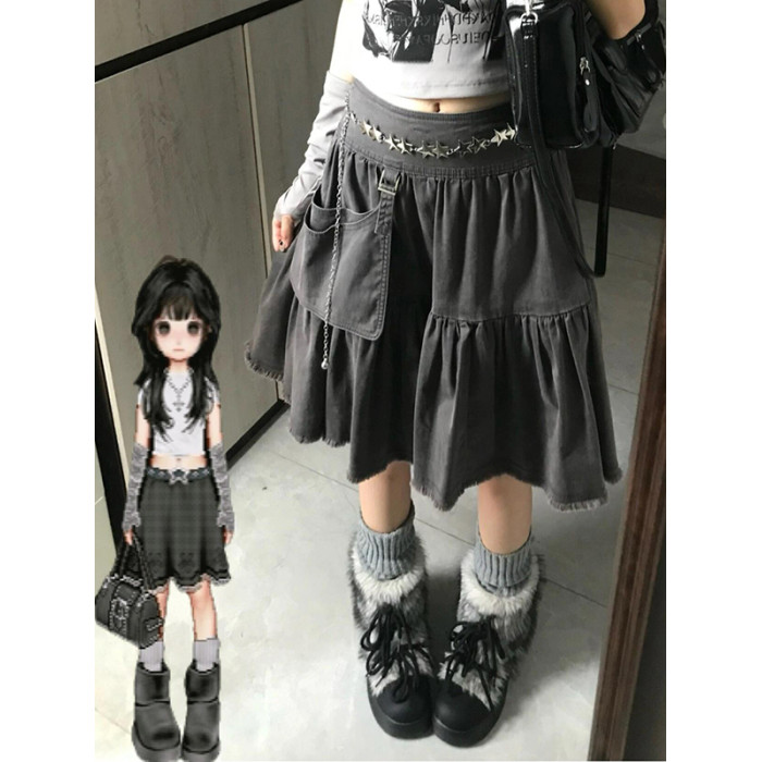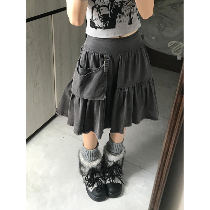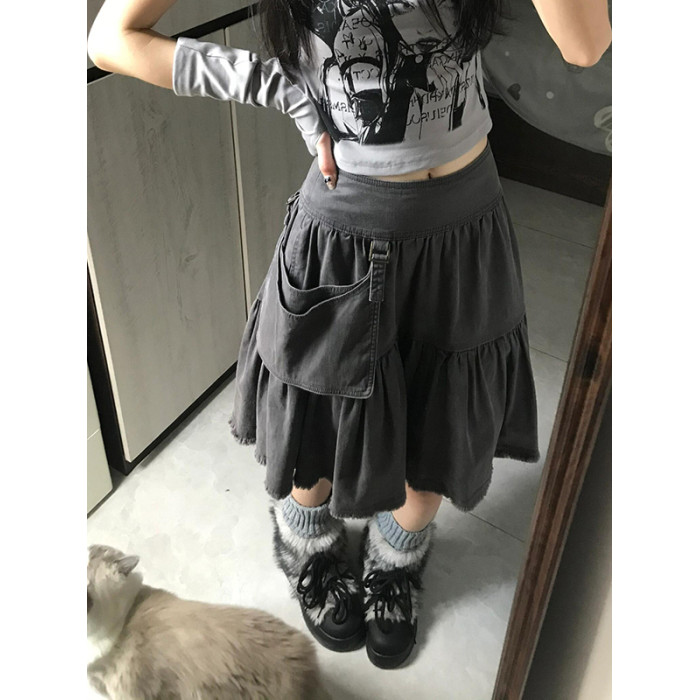 亞文化千禧灰色中裙工裝口袋毛邊百褶裙繖裙亞比辣妹設計感半身裙