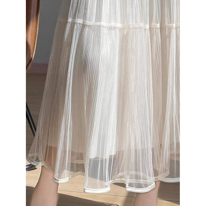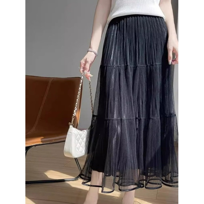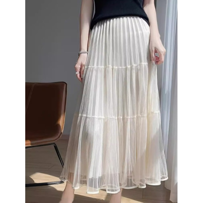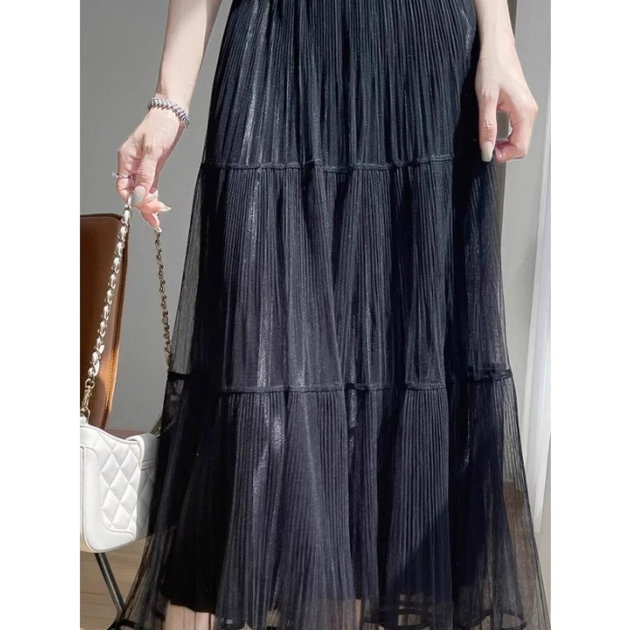 2025夏季款高腰中長款半身裙女百褶蛋糕裙長裙垂感氣質a字裙紗裙