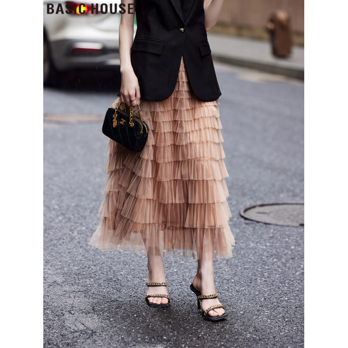 Basic House/百家好高腰網紗公主蛋糕裙A字半身裙女2025夏季新款