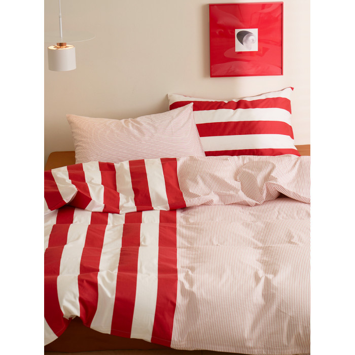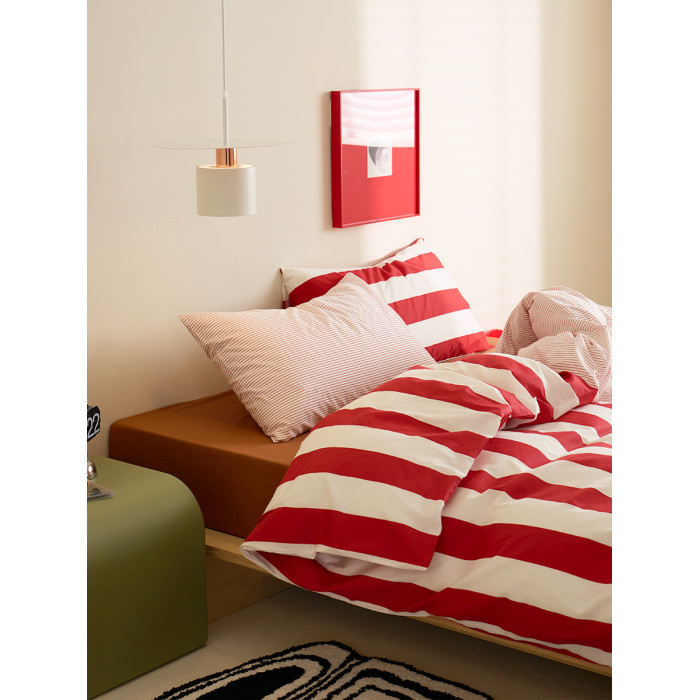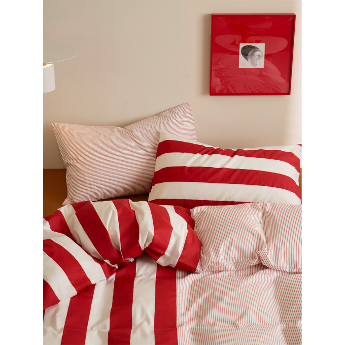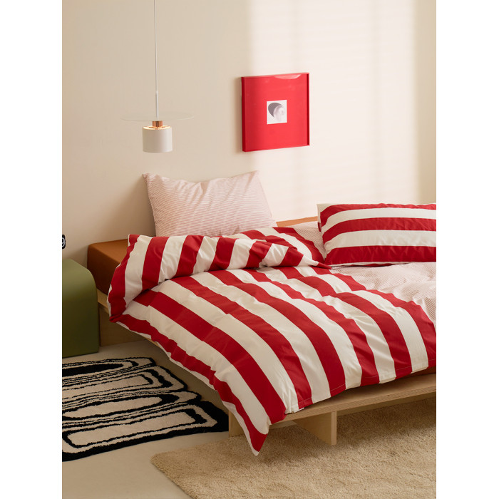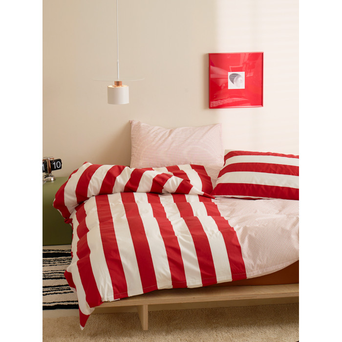 ins風紅色條紋純棉被套單件簡約雙拼全棉被罩床單四件套床上用品