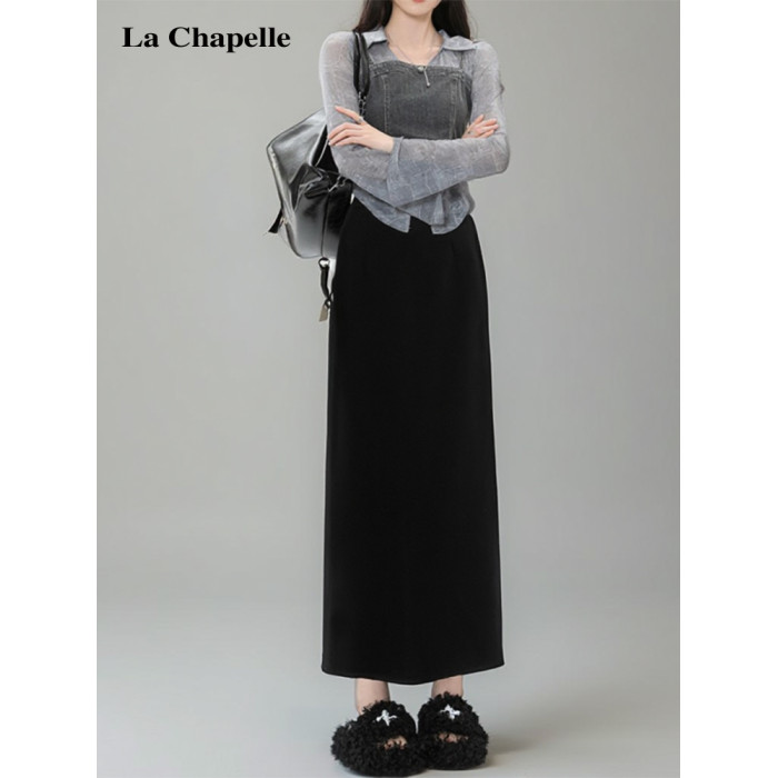 拉夏貝爾黑色西裝半身裙女夏季長款高腰垂感a字直筒一步包臀裙子