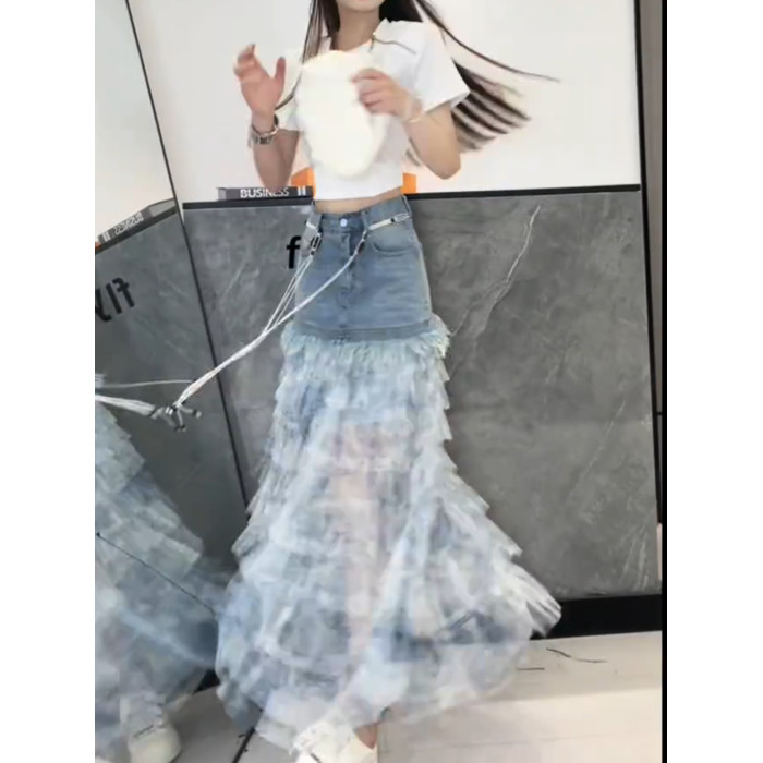 藍色紥染牛仔拼接半身裙女夏季新款洋氣蛋糕裙百搭時尚顯瘦a字裙