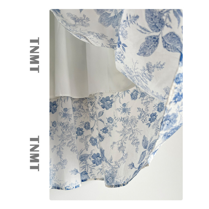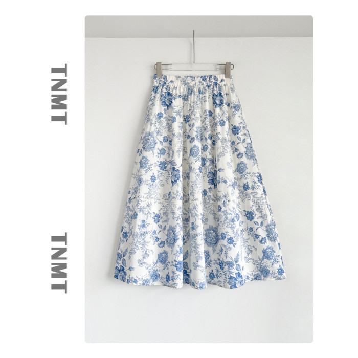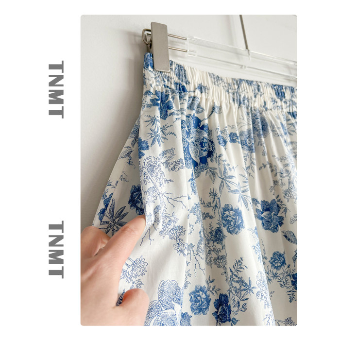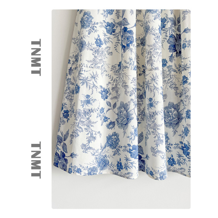 國風復古藍色青花瓷碎花半身裙女2025夏季新款純棉A字花苞裙繖裙