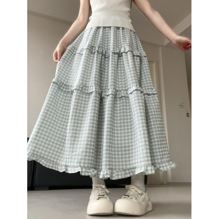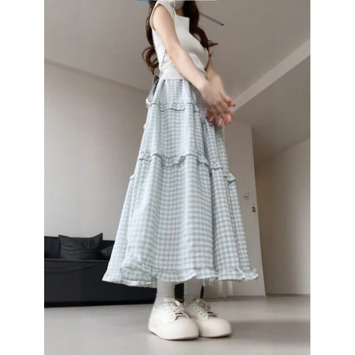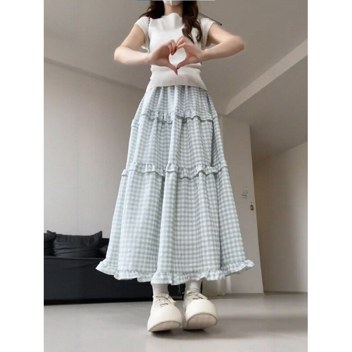 胖mm淺綠色格子蛋糕裙女2025新款大碼梨型身材高腰顯瘦a字半身裙