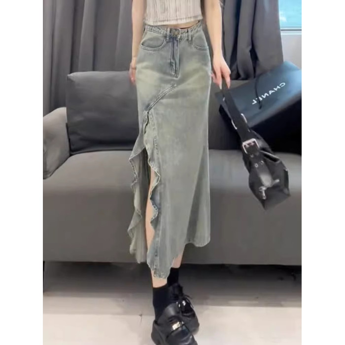 拉夏貝爾牛仔半身裙女夏季2025新款美式修身荷葉邊開叉包臀魚尾裙