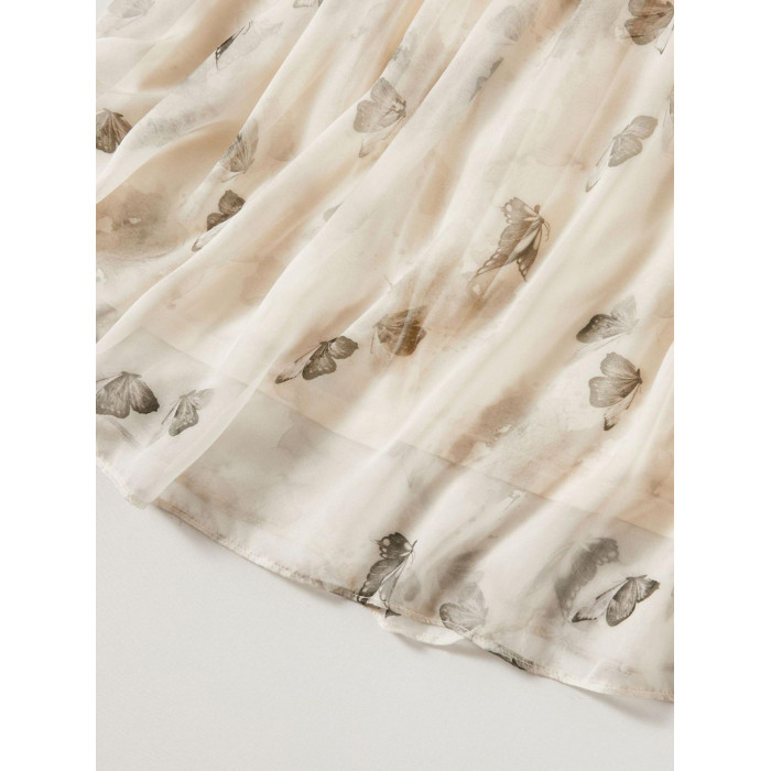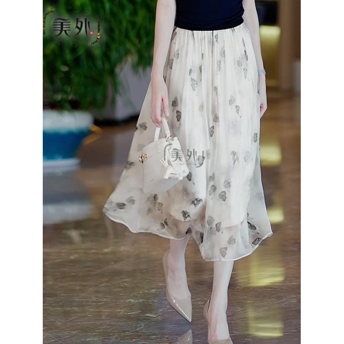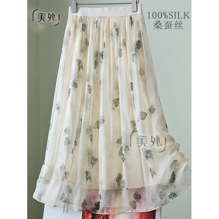 新款真絲半身裙女2025夏季蝴蝶碎花高腰顯瘦遮肉桑蠶絲中長A字裙