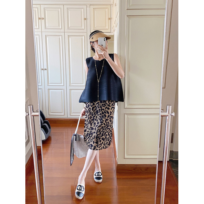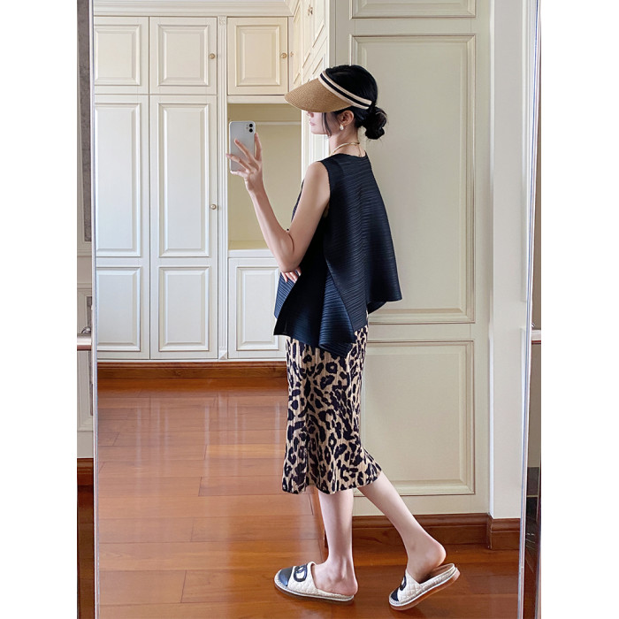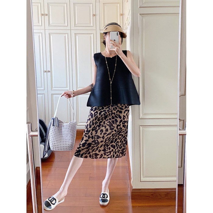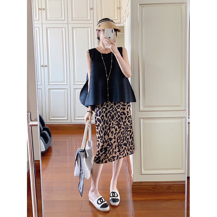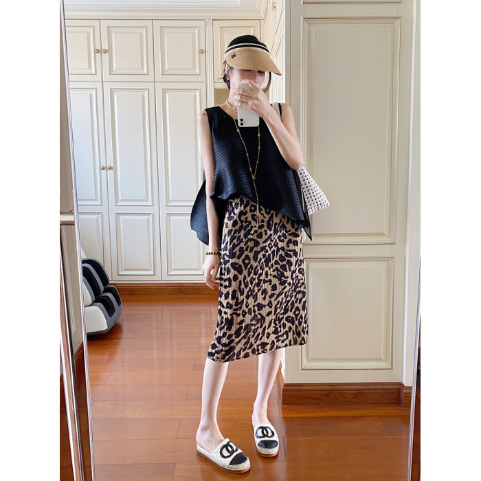 夏季三宅褶皺半身裙女復古時髦松緊腰垂感顯瘦豹紋印花a字半裙新