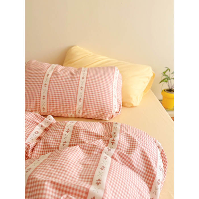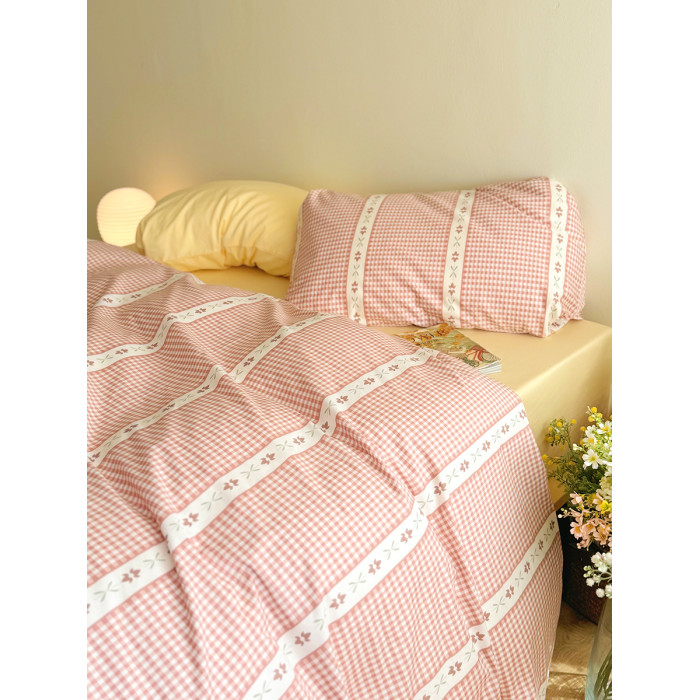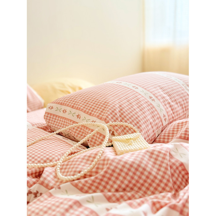 少女心粉色格子純棉全棉被套單件雙人床上四件套被罩單人1.8m床笠