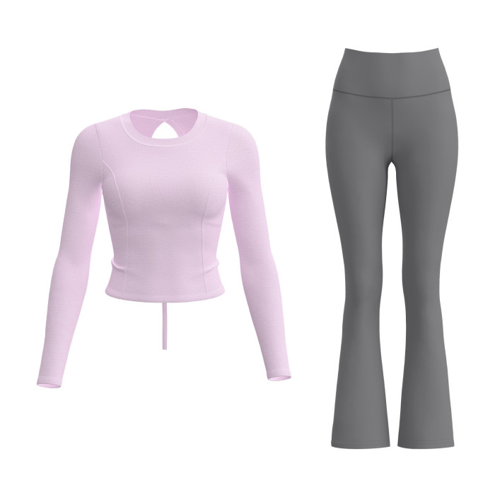 聚衣堂新款運動套裝抽繩長袖喇叭褲透氣跑步訓練健身套裝女