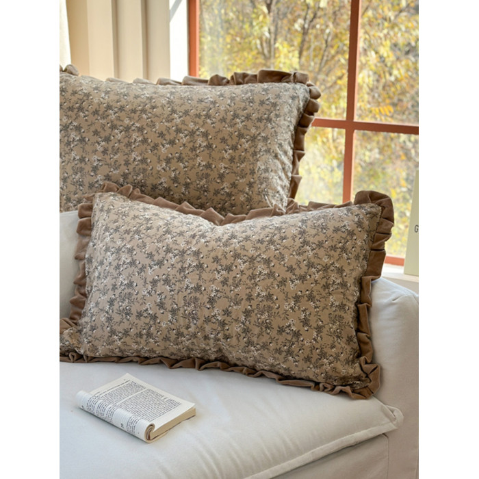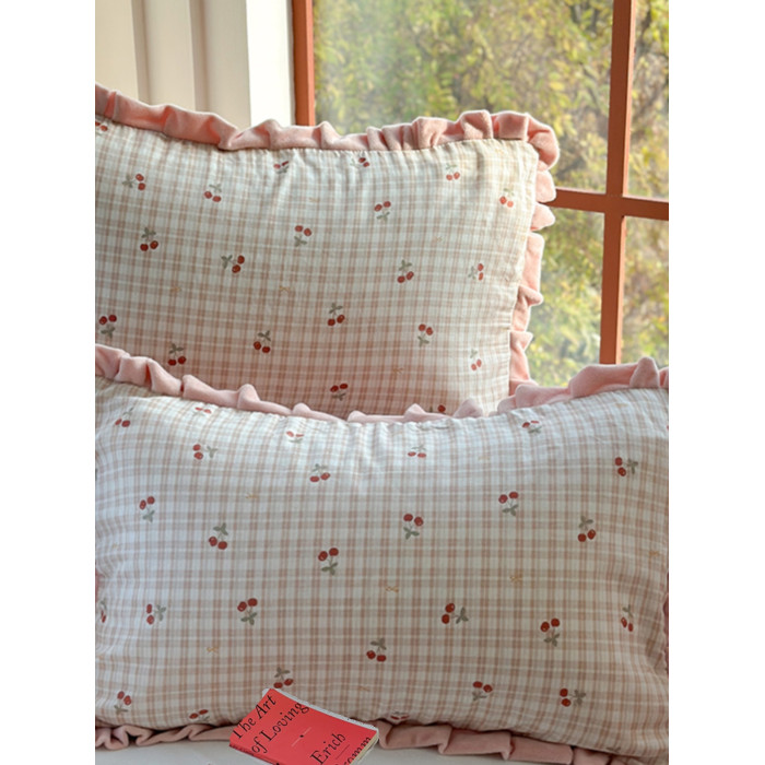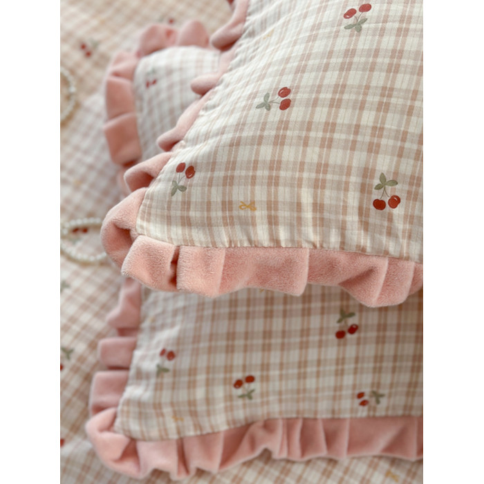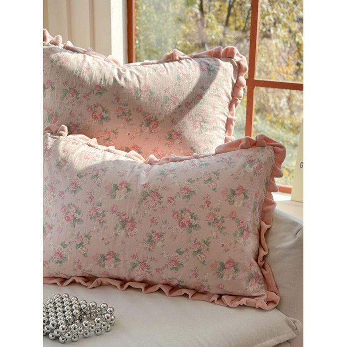 法式復古咖碎花全棉雙層紗豆豆絨枕套2024新款純棉加絨花邊枕頭套