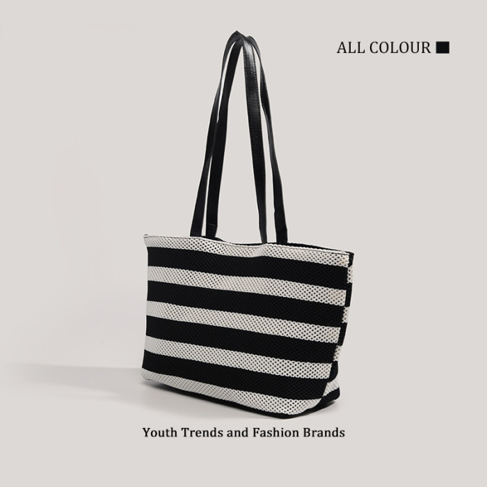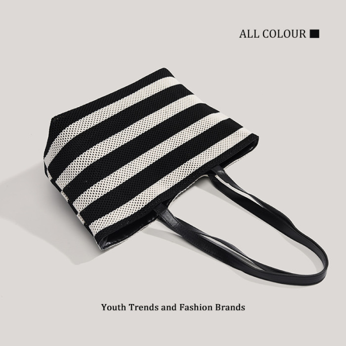 高級感黑白條紋托特包編織大容量單肩女包懶惰風輕便度假包購物袋