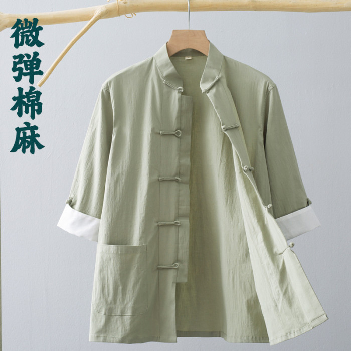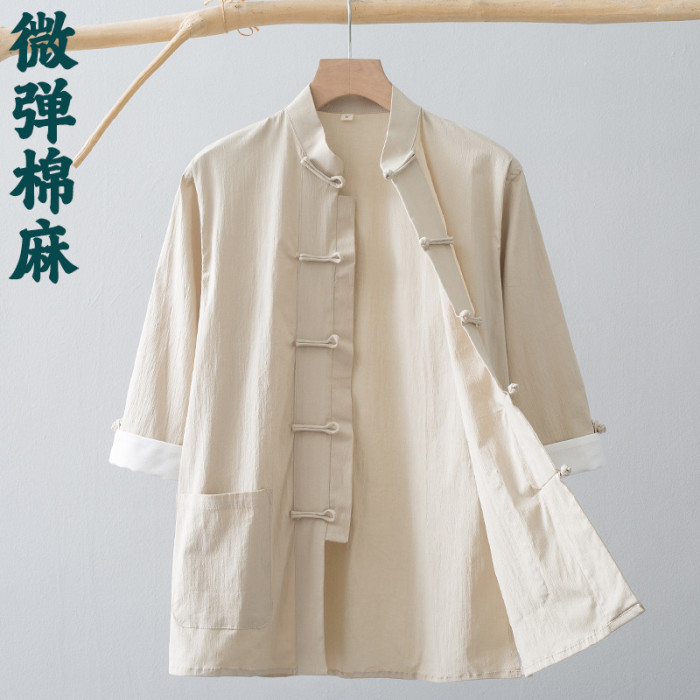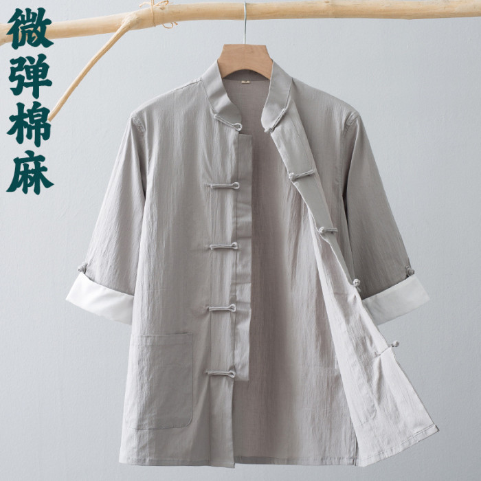 唐裝男青年夏季薄款短袖中袖風男裝中式復古盤釦棉麻襯衫襯衣