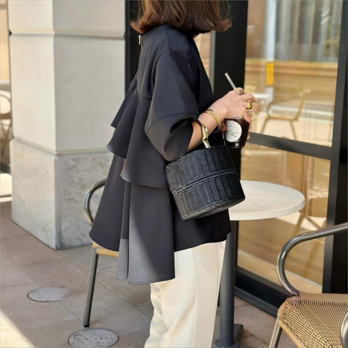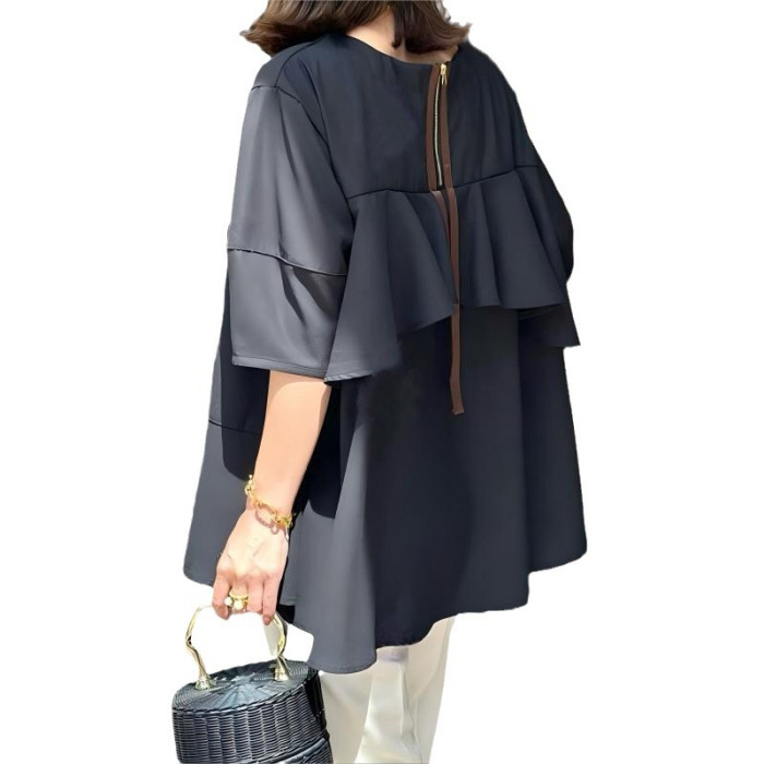 日系2024夏裝圓領後領中拉鍊旁撞色織帶上衣