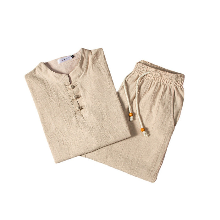 春秋季新款風男裝純色棉麻長袖長褲套裝男大碼寬松時尚兩件套