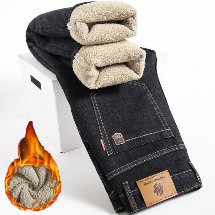 加絨加厚牛仔褲男款寬松直筒長褲2023新款中年棉彈秋冬季保暖