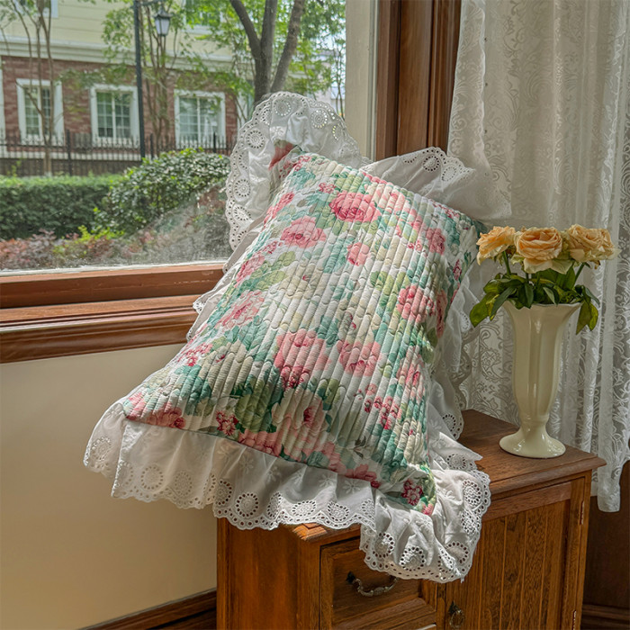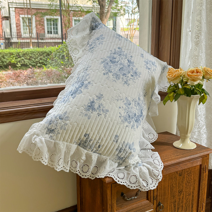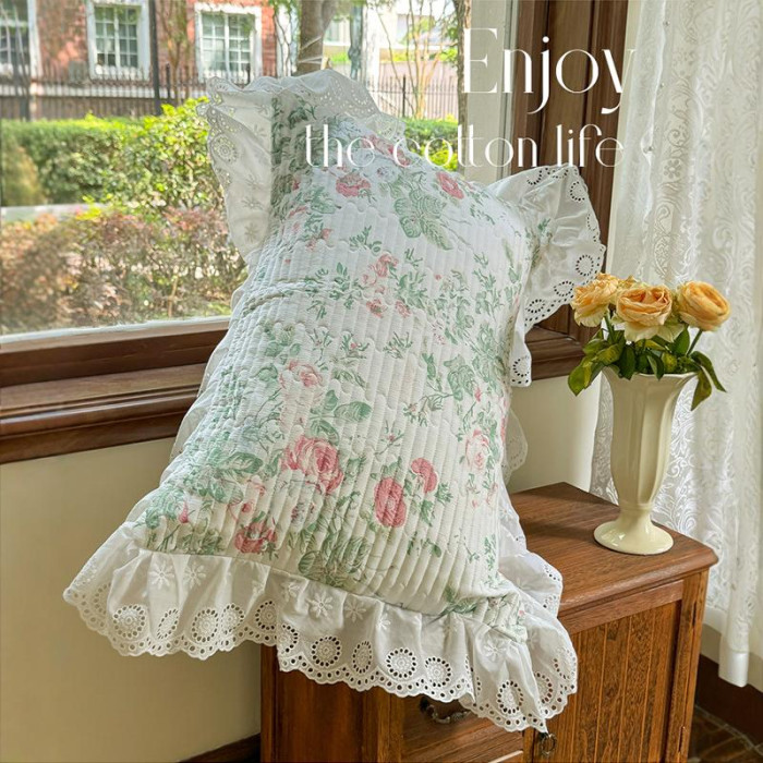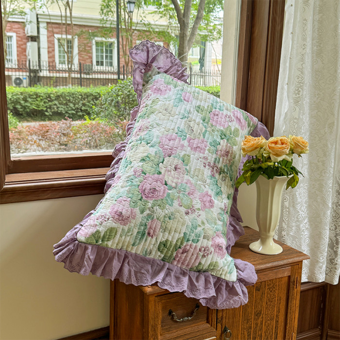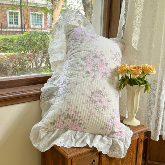 全棉法式田園風枕套一對裝純棉絎縫夾棉花邊枕頭套少女印花48*74