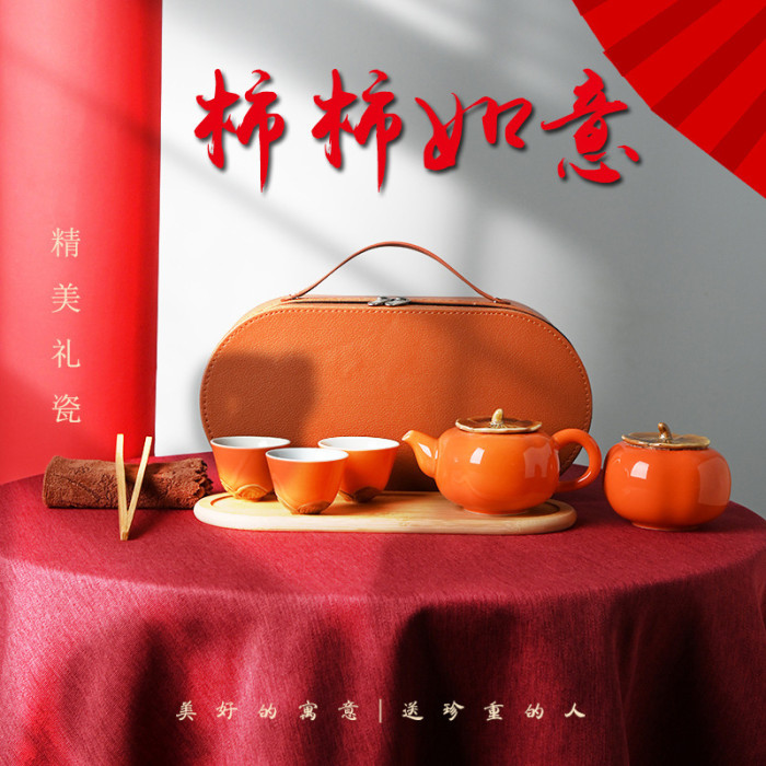 柿子茶具套裝陶瓷旅行可攜式包帶茶盤商務禮品快客杯事事如意伴手禮