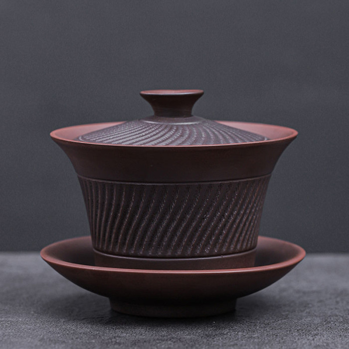 紫砂跳刀三才蓋碗陶瓷茶具茶碗家用單個懸停蓋碗紫陶大號泡茶器