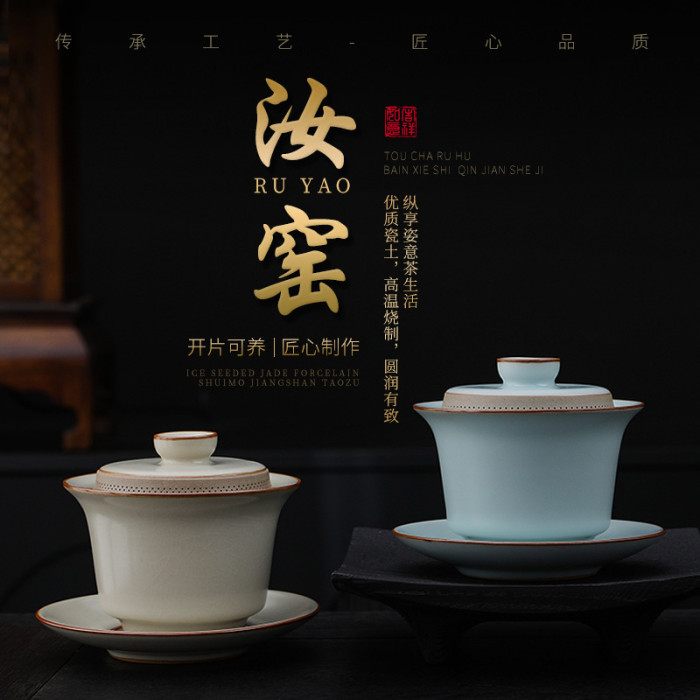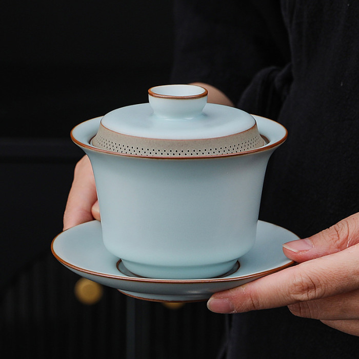 360度出水大號汝窰三才蓋碗防燙汝瓷自帶過濾簡約陶瓷天青手抓壺
