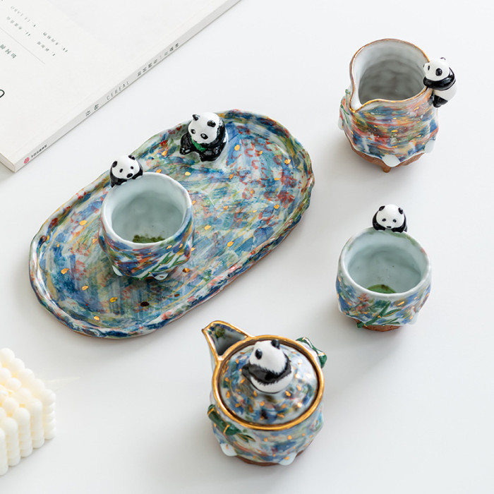 七彩志野熊貓寶瓶壺巖礦日式純手工復古粗陶茶壺蓋碗手抓泡茶壺