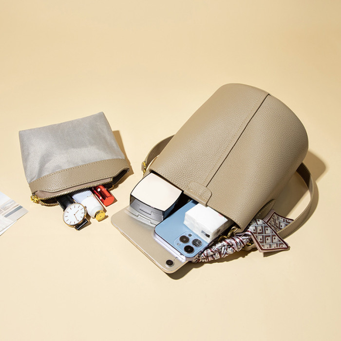 2024絲巾飾品小包包荔枝紋軟皮時尚手提水桶包大容量斜背字母包