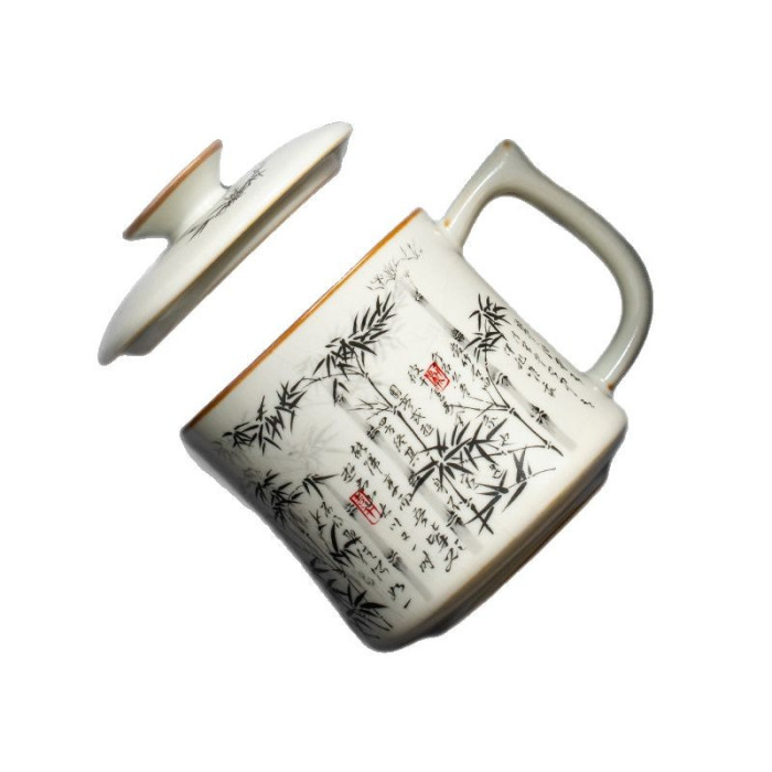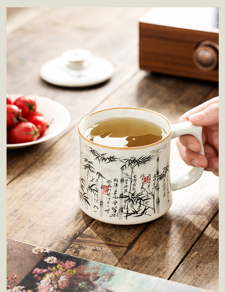汝窰墨竹茶杯陶瓷帶蓋水杯馬克杯個人專用高檔辦公室喝茶杯子