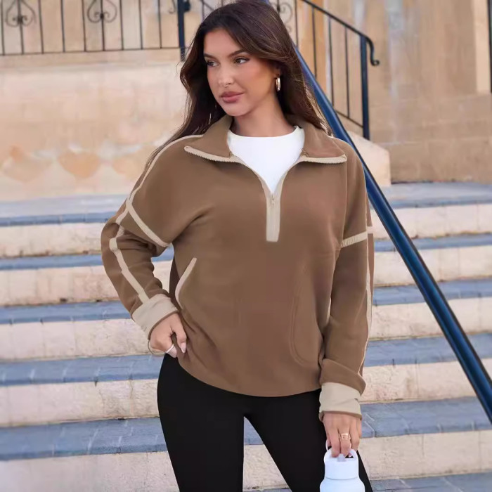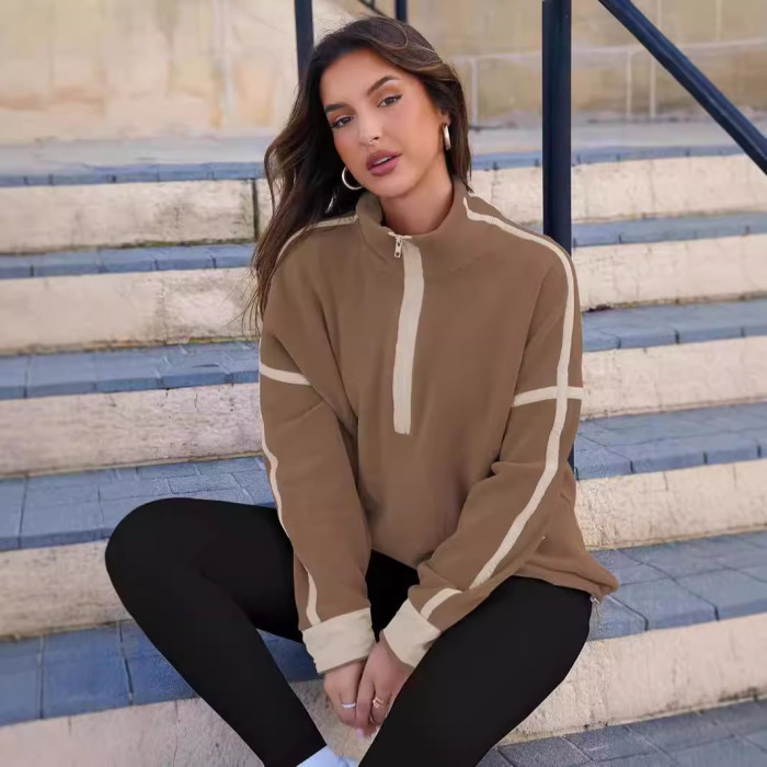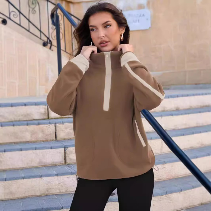 女士拉鍊運動衫 連帽衫長袖立領套頭衫休閒拼色上衣帶口袋