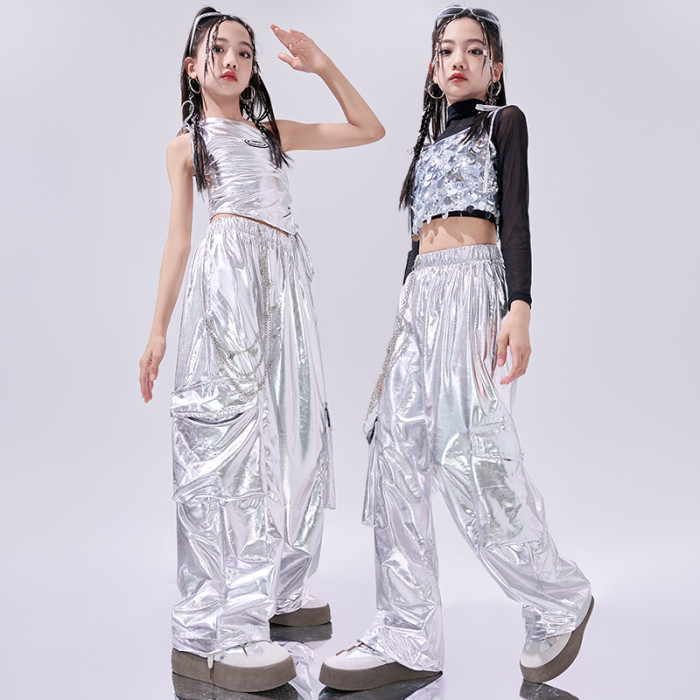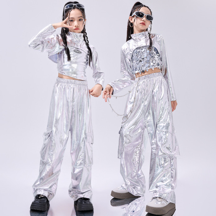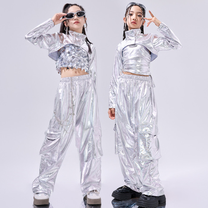 女童爵士舞服裝銀色亮片潮酷炸街兒童jazz走秀演出服架子鼓表演服