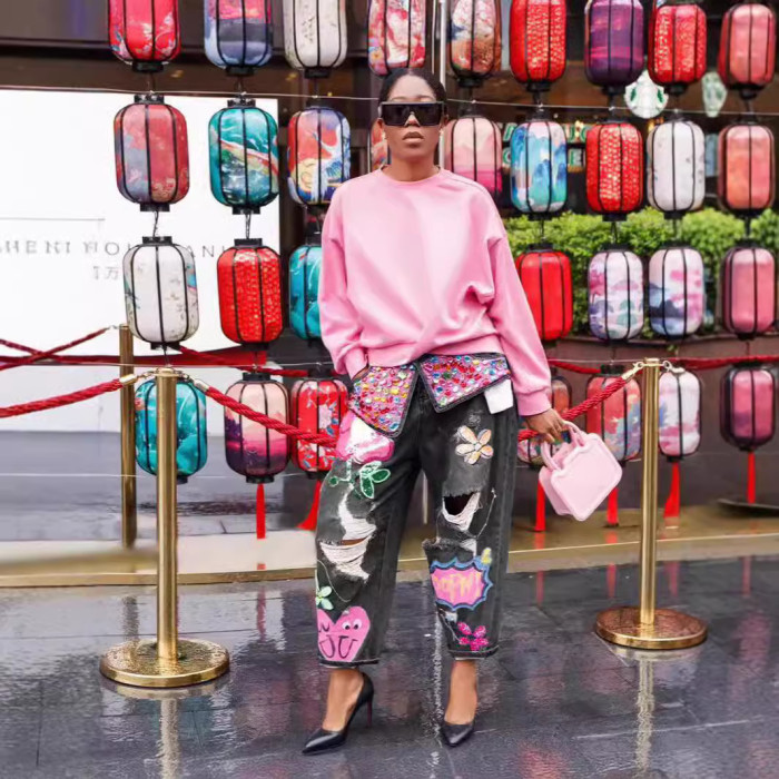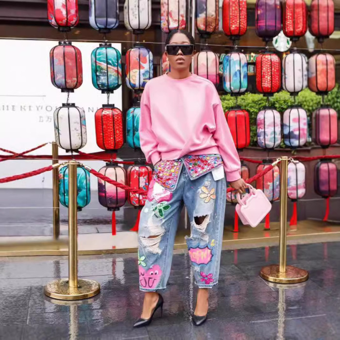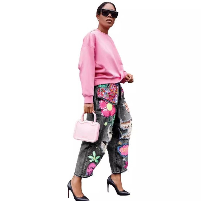 D8685     新品歐美時尚燙鑽定位印花割破牛仔褲