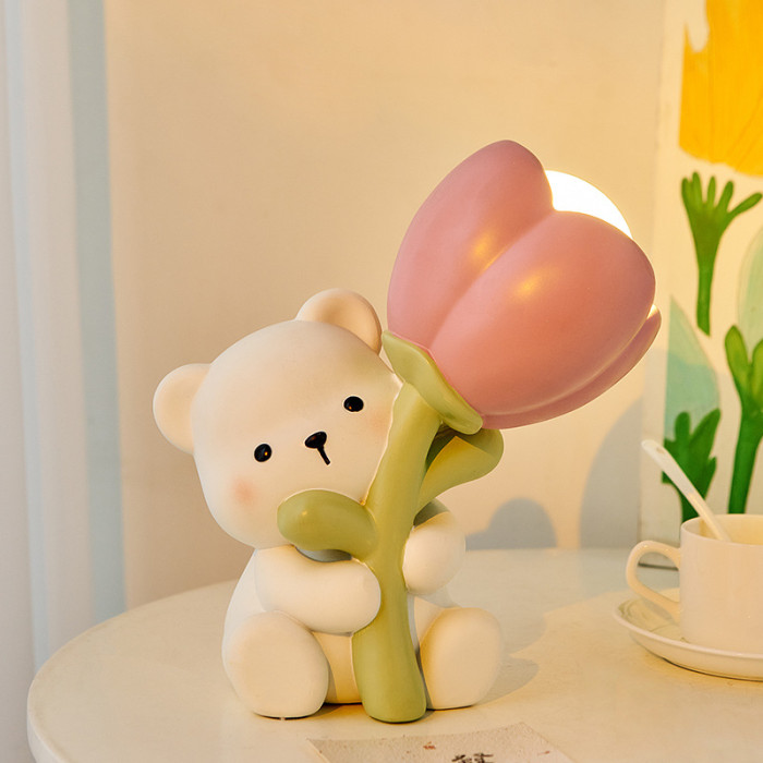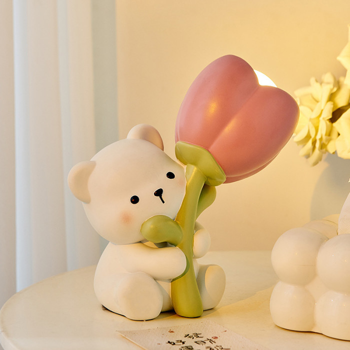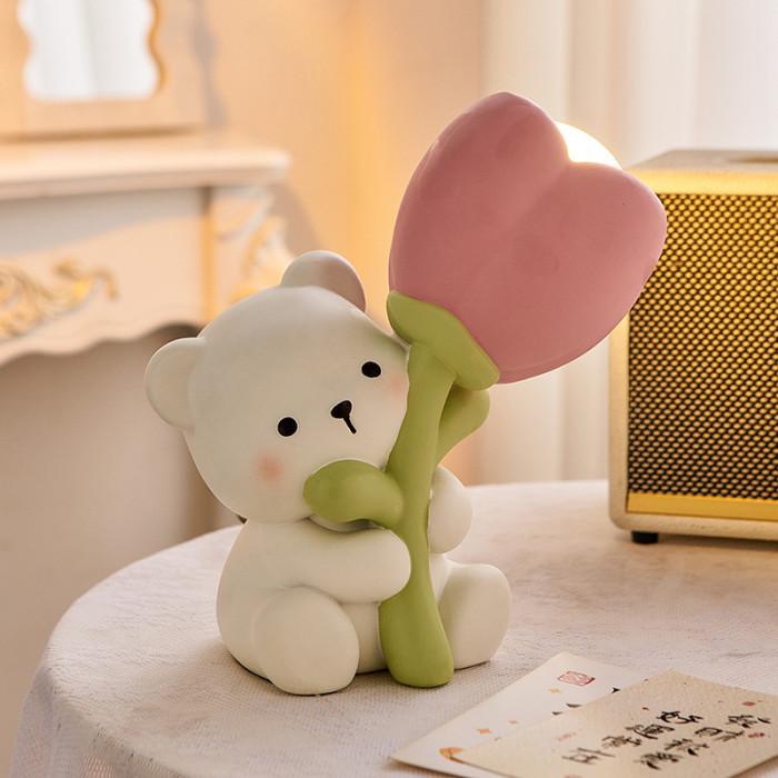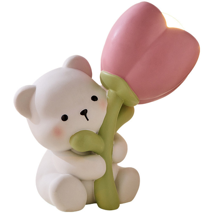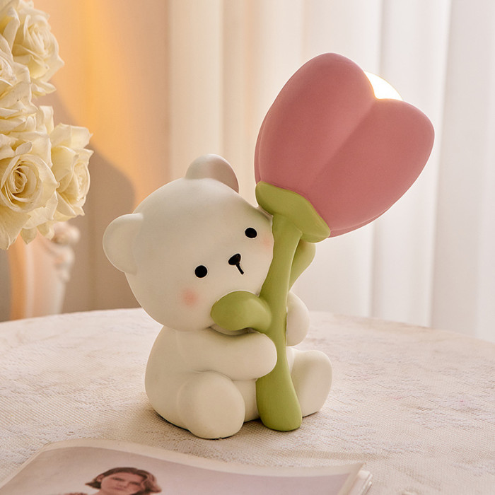 可愛小白熊樹脂鬱金香小夜燈桌面臥室家居小擺件軟裝小禮物裝飾品