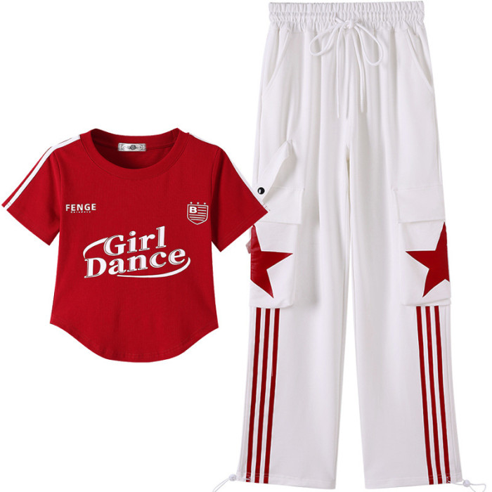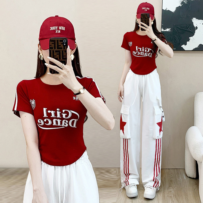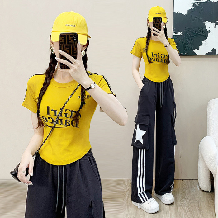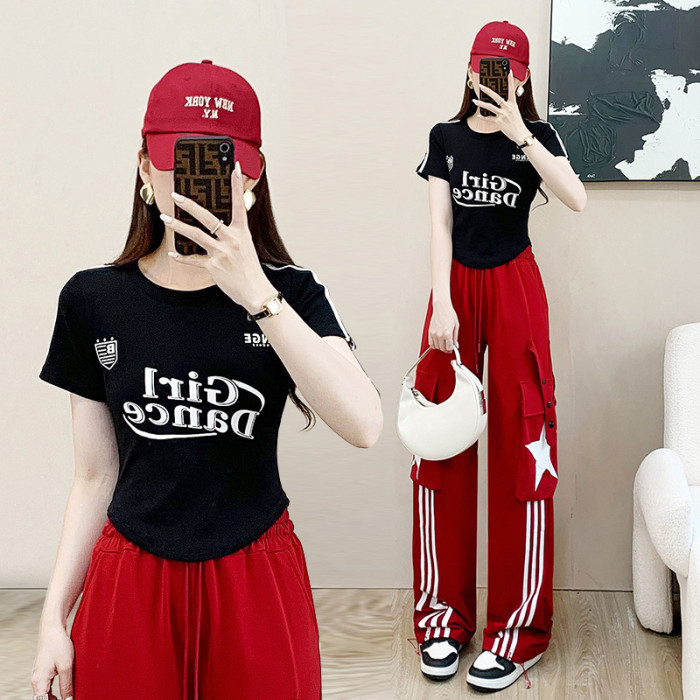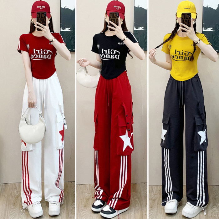 時尚休閒運動套裝女夏季2024新款顯瘦T恤搭配杠條工裝褲兩件套