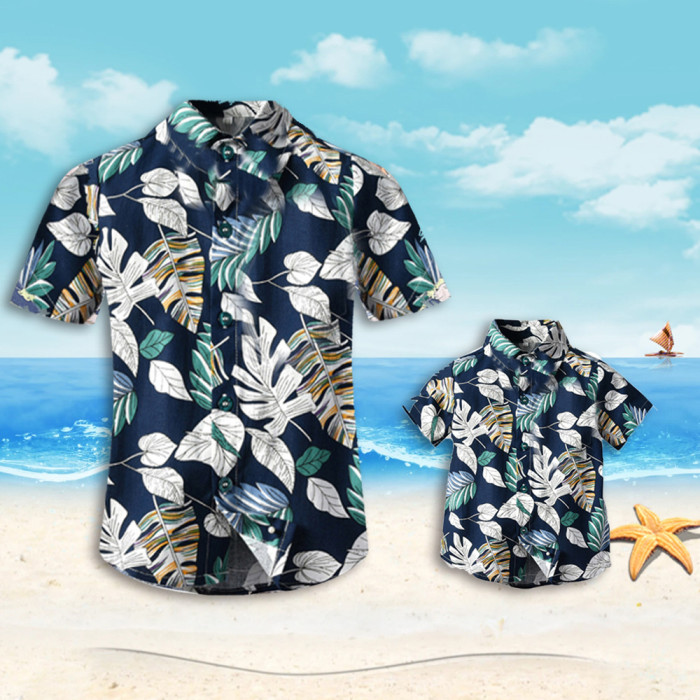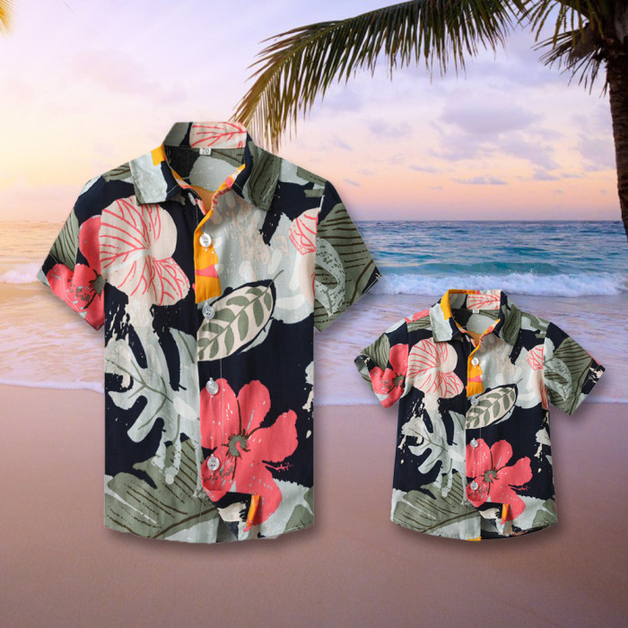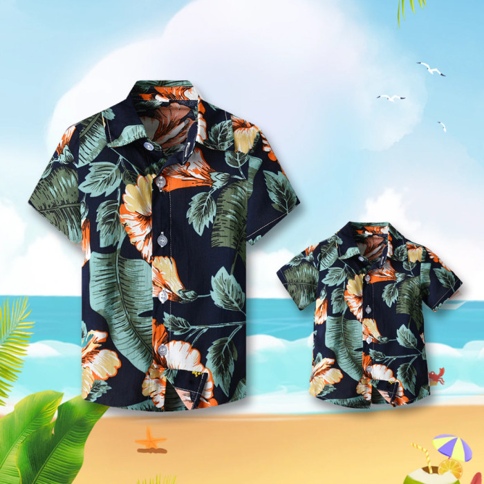 夏季親子裝度假風翻領短袖印花休閒薄款襯衫夏威夷家庭裝