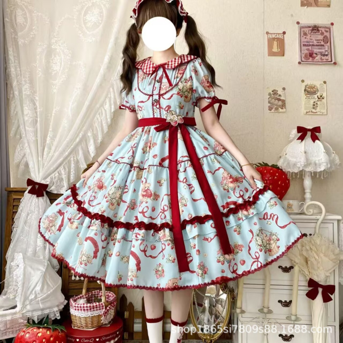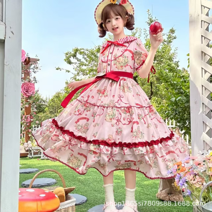 X日系學風蘋果印花娃娃領洛麗塔連衣裙女學生夏季新款可愛a字裙