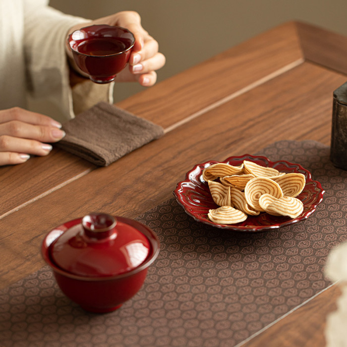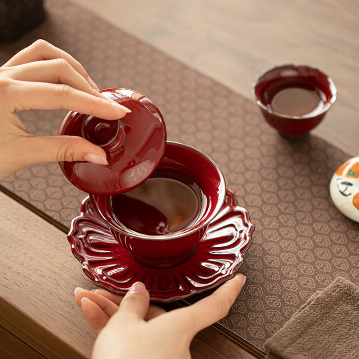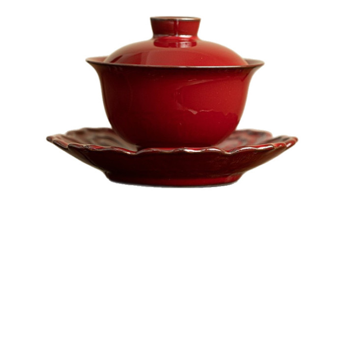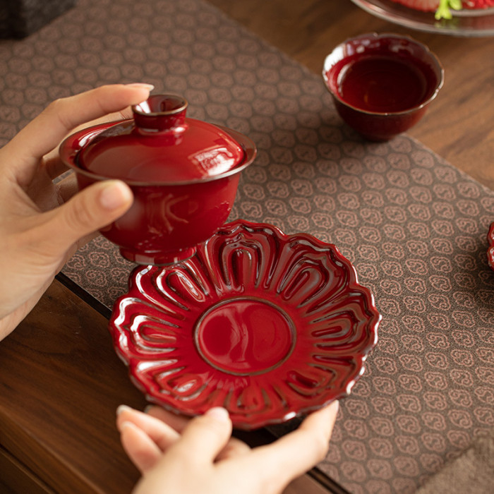 新款整套窰變郎紅故宮紅三才蓋碗陶瓷茶具蓮花壺承泡茶碗喜慶