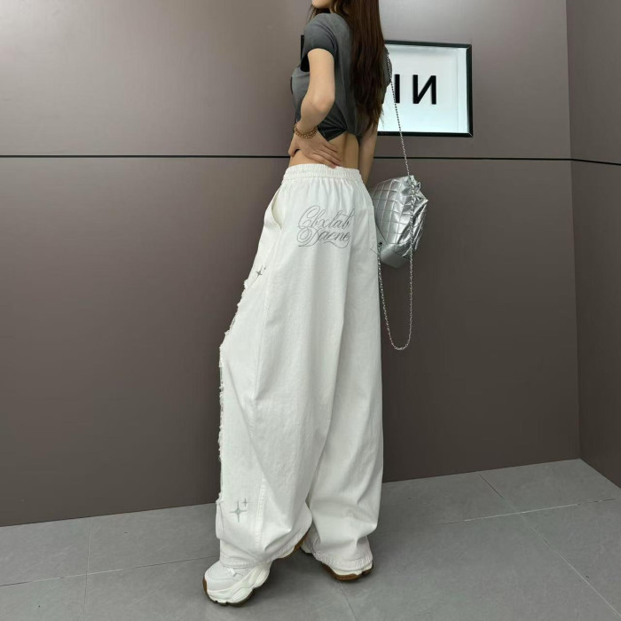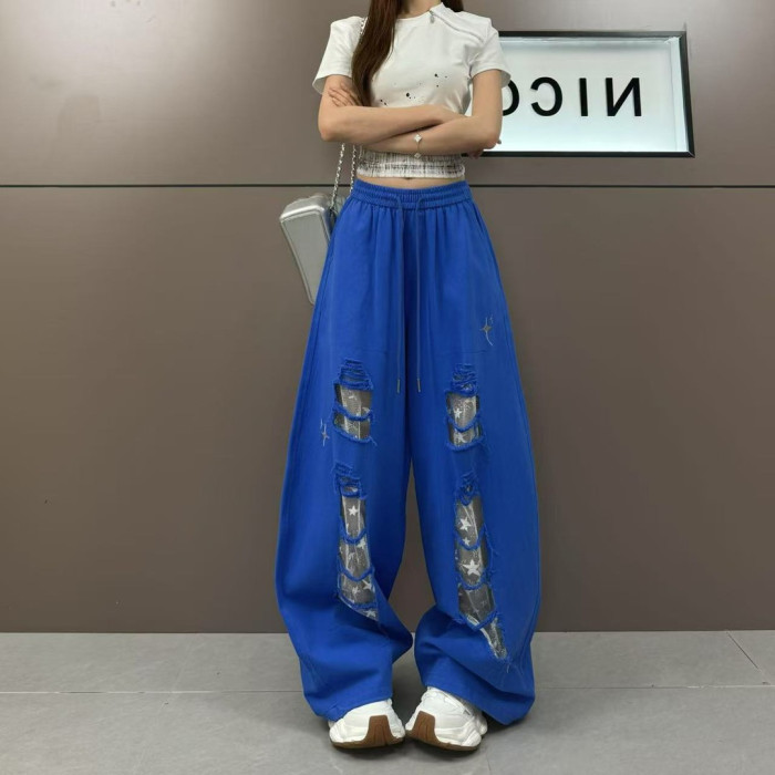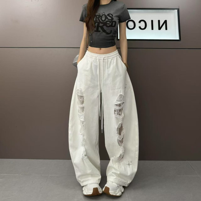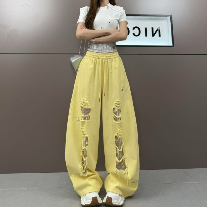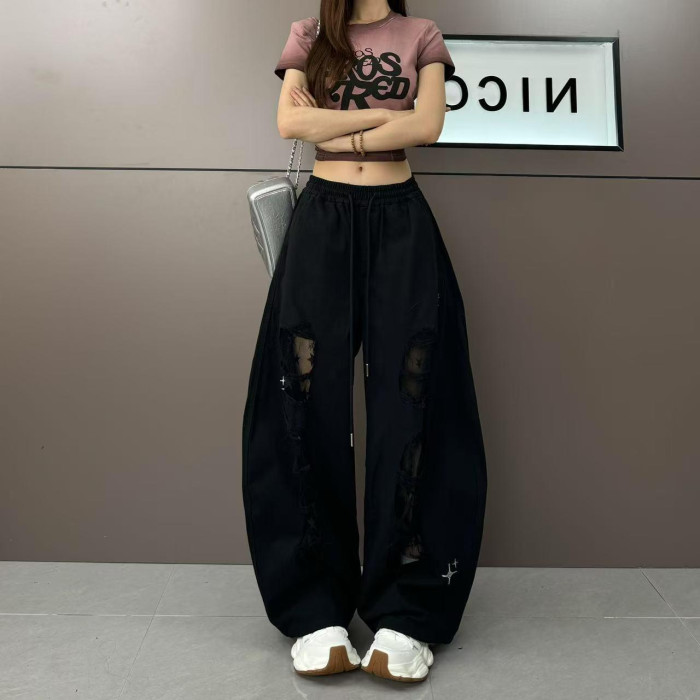 2025夏季美式街頭復古拼接鏤空蕾絲個性破洞設計時尚顯瘦休閒褲