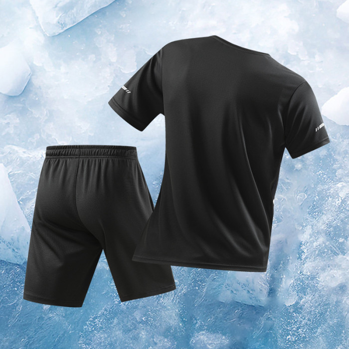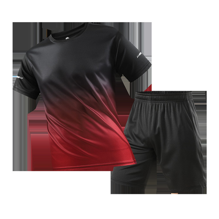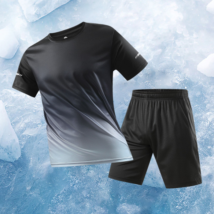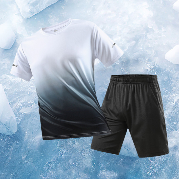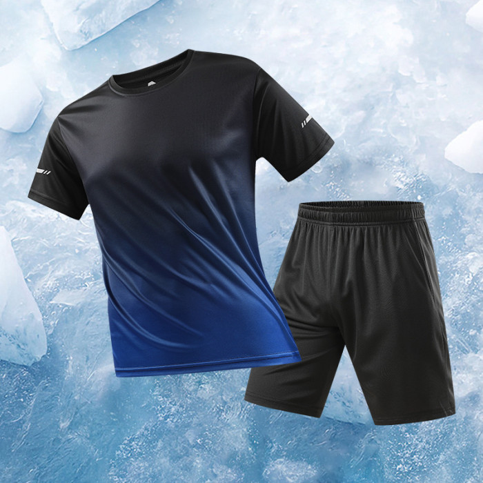 夏季運動套裝男士跑步速乾休閒冰絲T恤短褲騎行五分褲漸變兩件套
