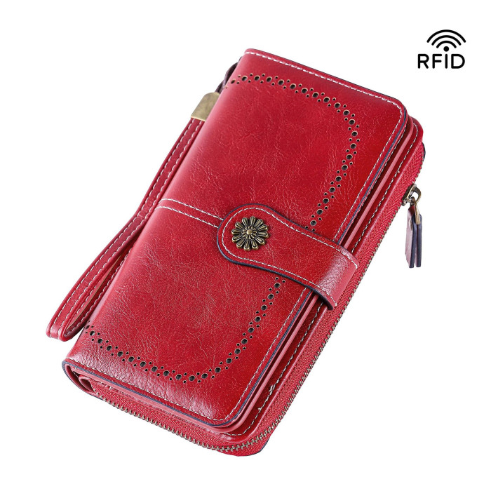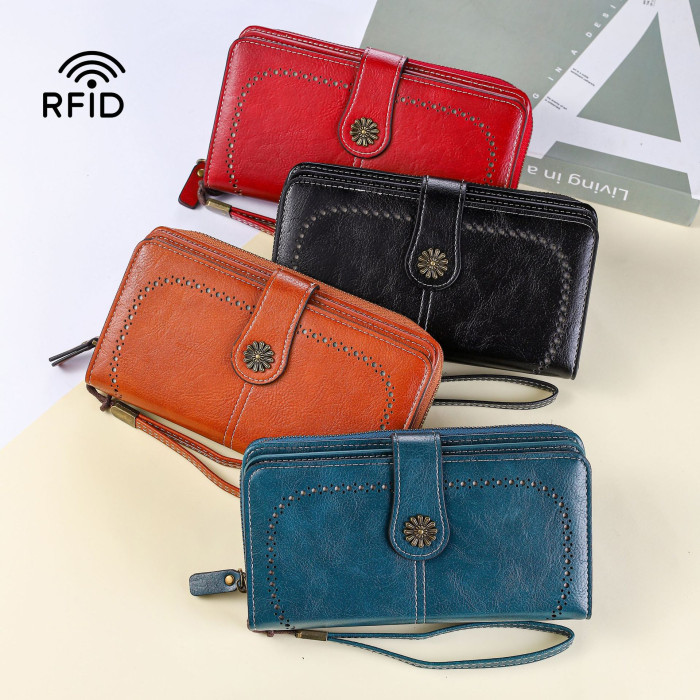 復古多功能防盜刷RFID拉鍊按釦大容量長款女士錢包錢夾手拿包