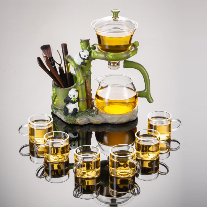 玻璃自動茶具熊貓帶六君子泡茶器-+公道盃+6盃