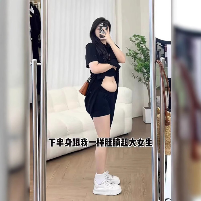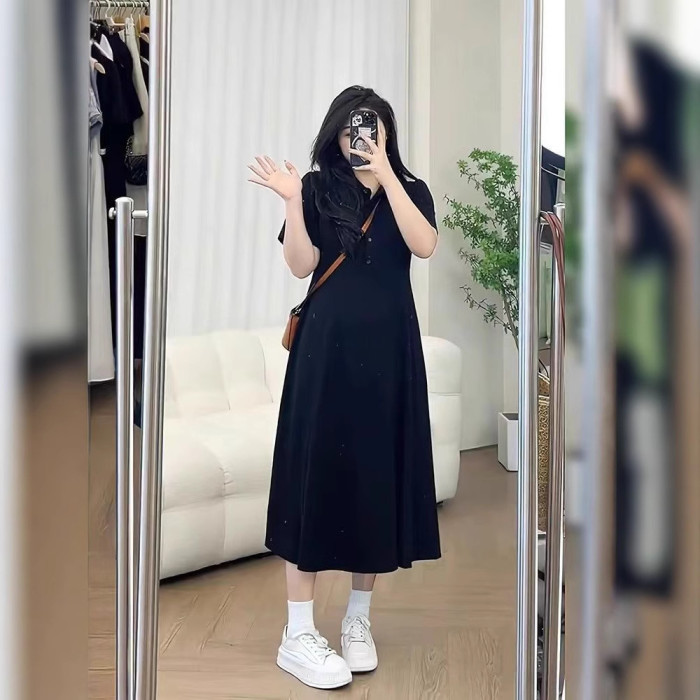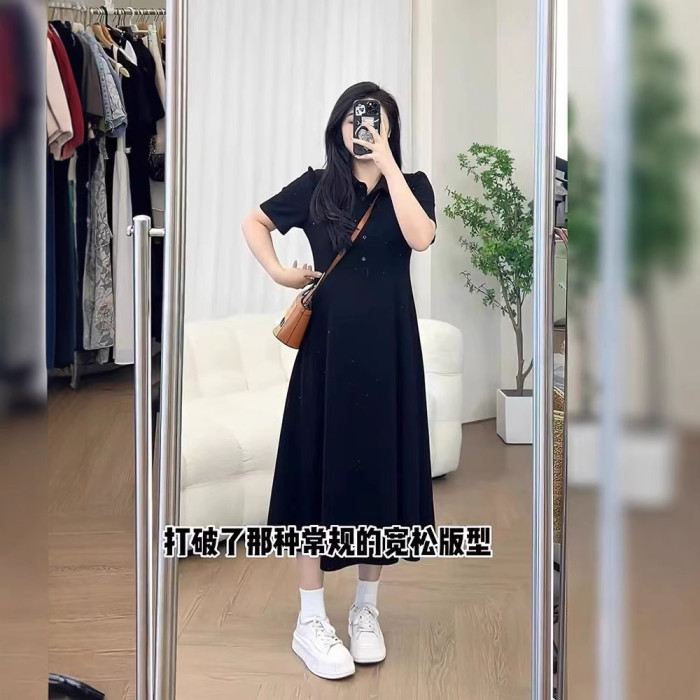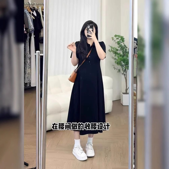 特大碼300斤胖mm夏季新款高級感寬松甜美polo領美式收腰顯瘦長裙
