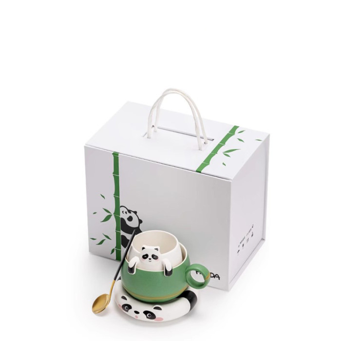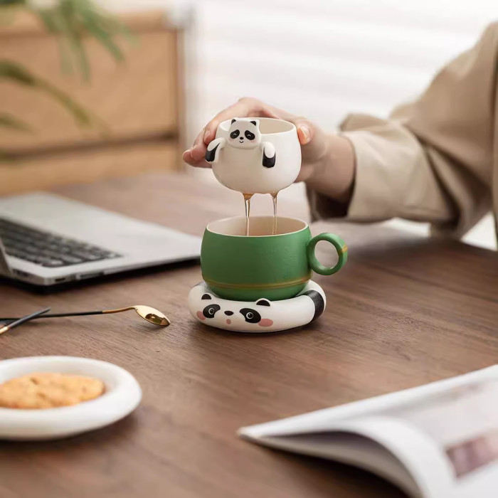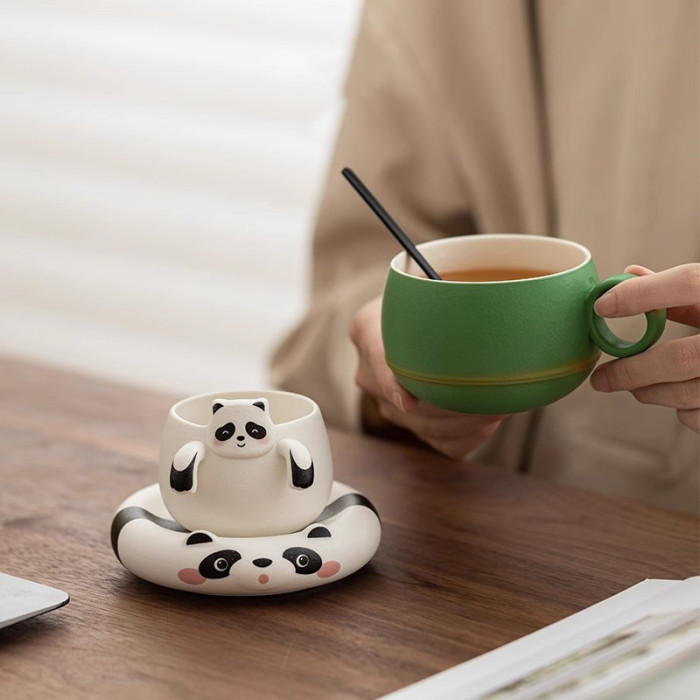 創意熊貓咖啡杯碟套裝帶勺子高檔精緻杯子女陶瓷高顔值馬克杯禮物