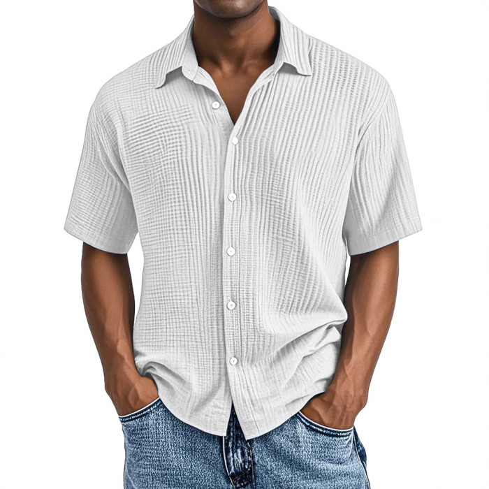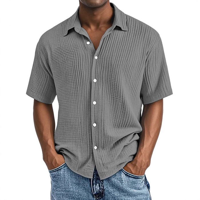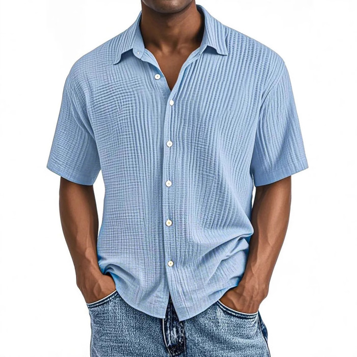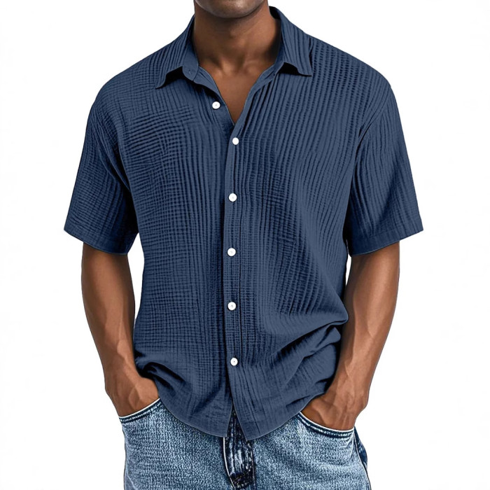 2025-春夏季歐美獨立站男士短袖翻領襯衫雙層皺布休閒襯衫