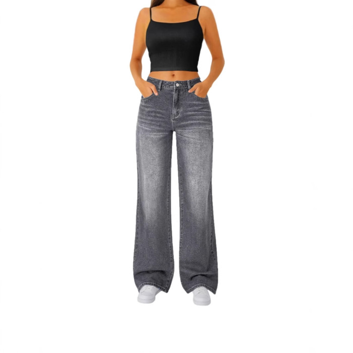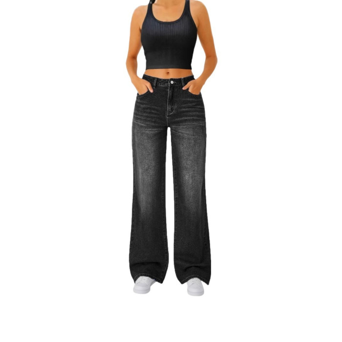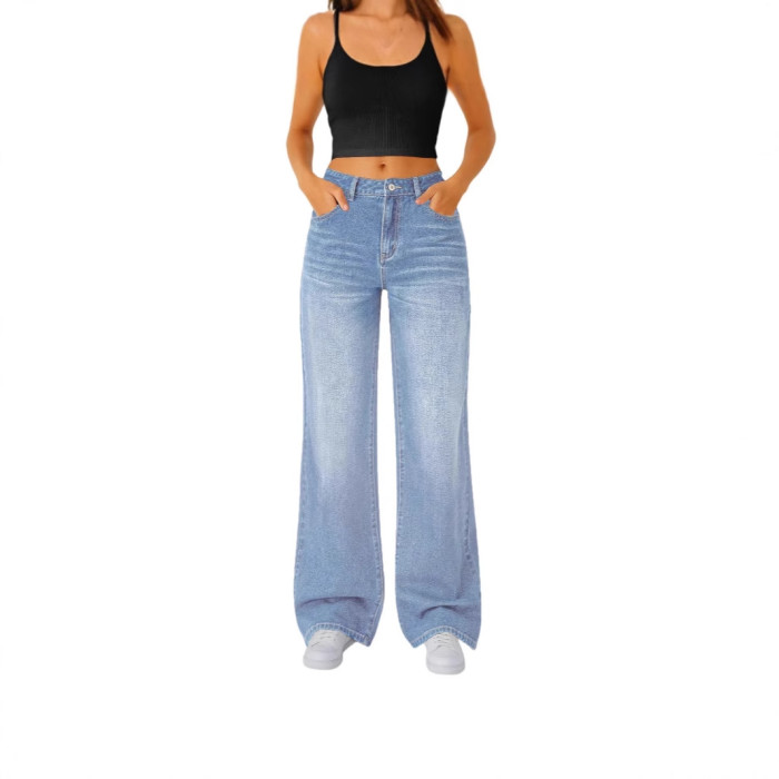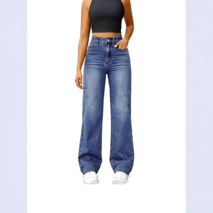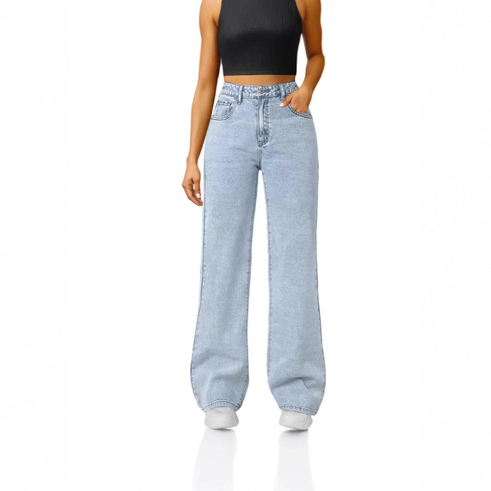 女士休閒直筒牛仔褲 微喇 彈力腰