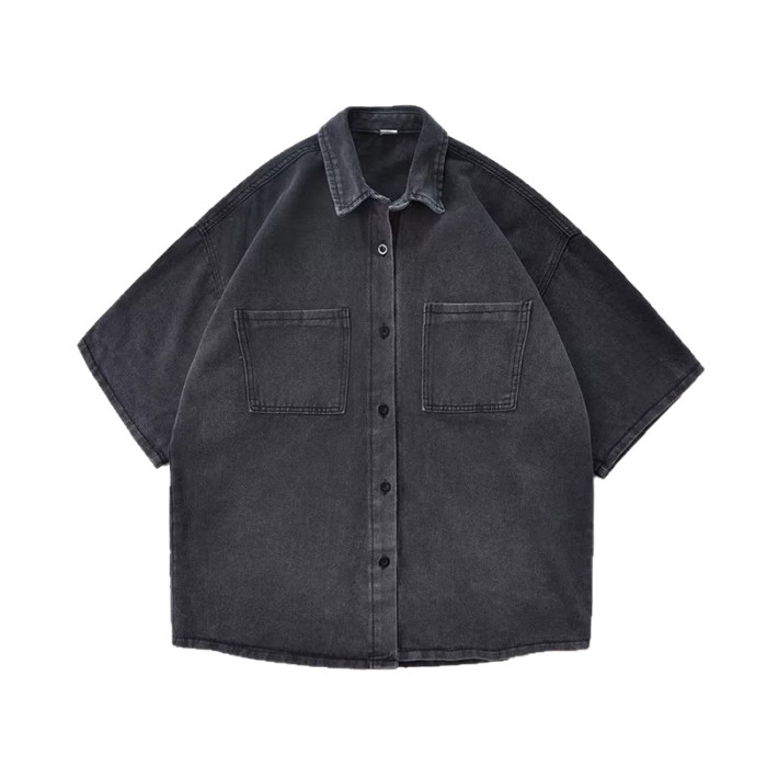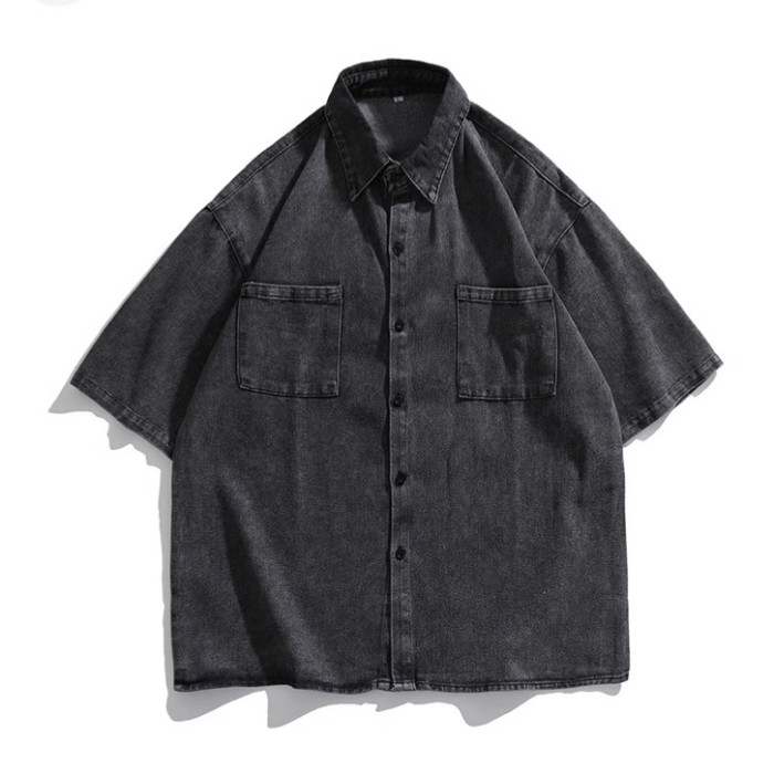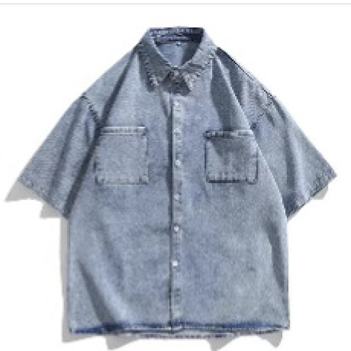 夏季新款港風寬松五分短袖牛仔男士襯衫韓版情侶寬松半袖短袖襯衣