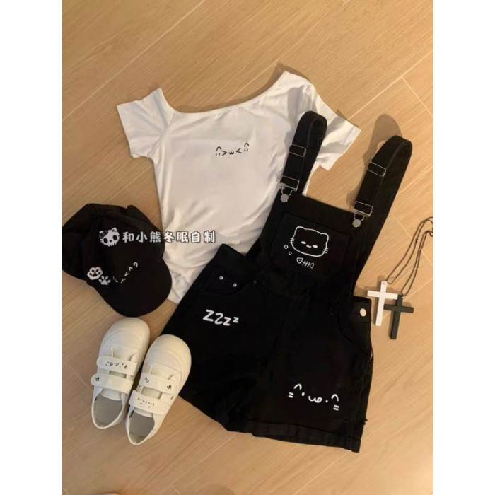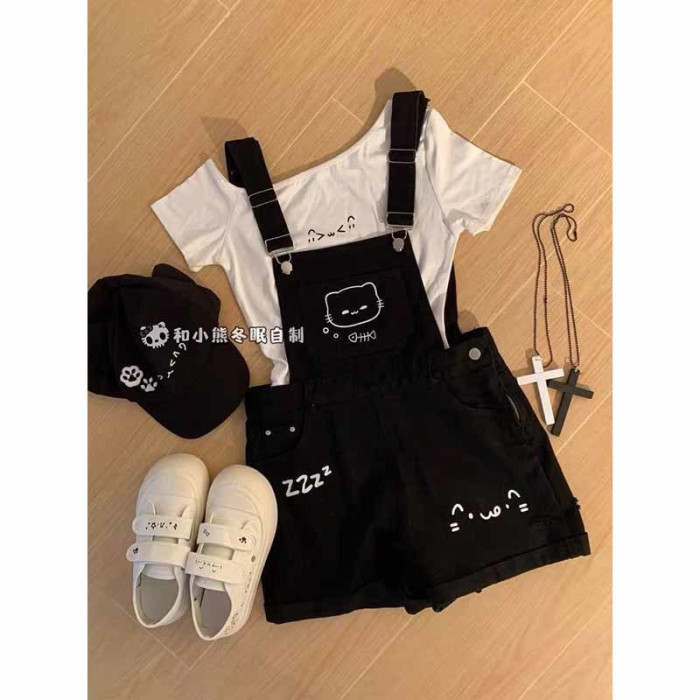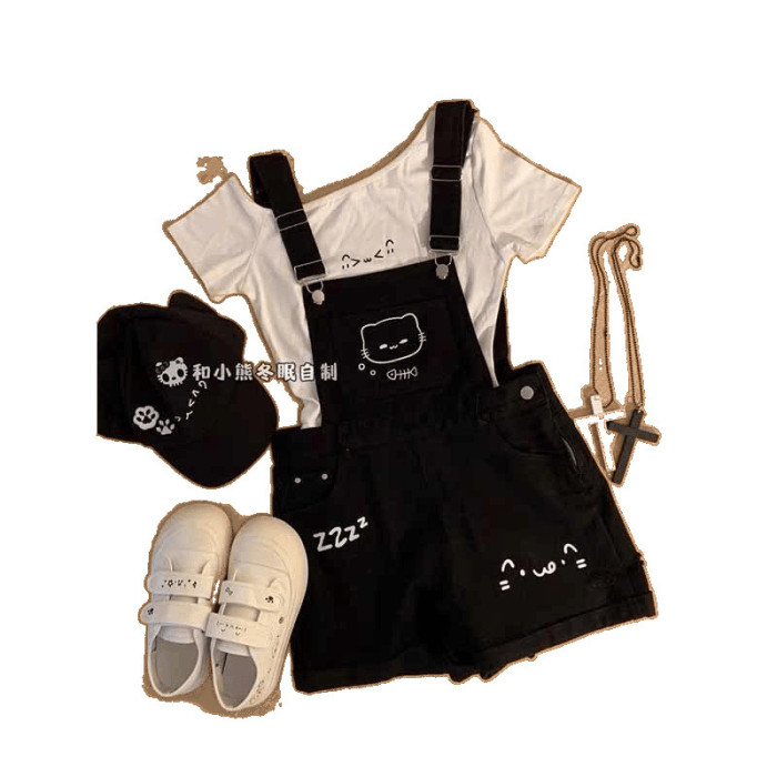 胖mm美式甜美可愛印花牛仔短褲女大碼夏新款高街百搭顯瘦背帶熱褲